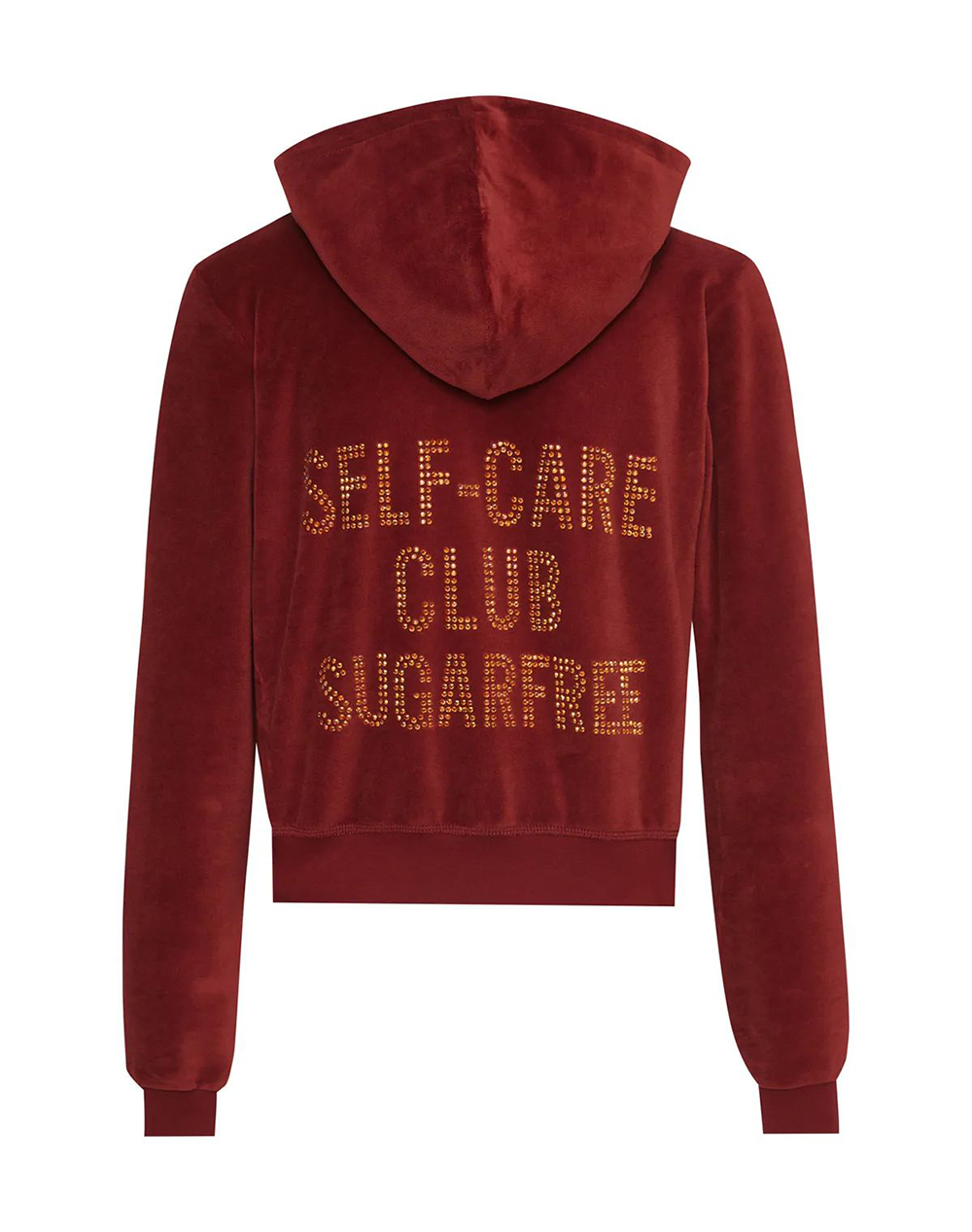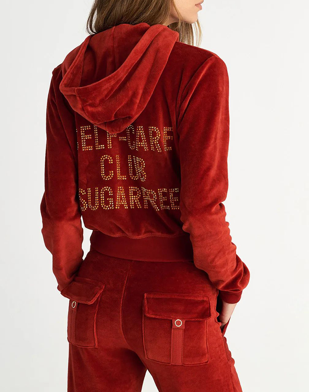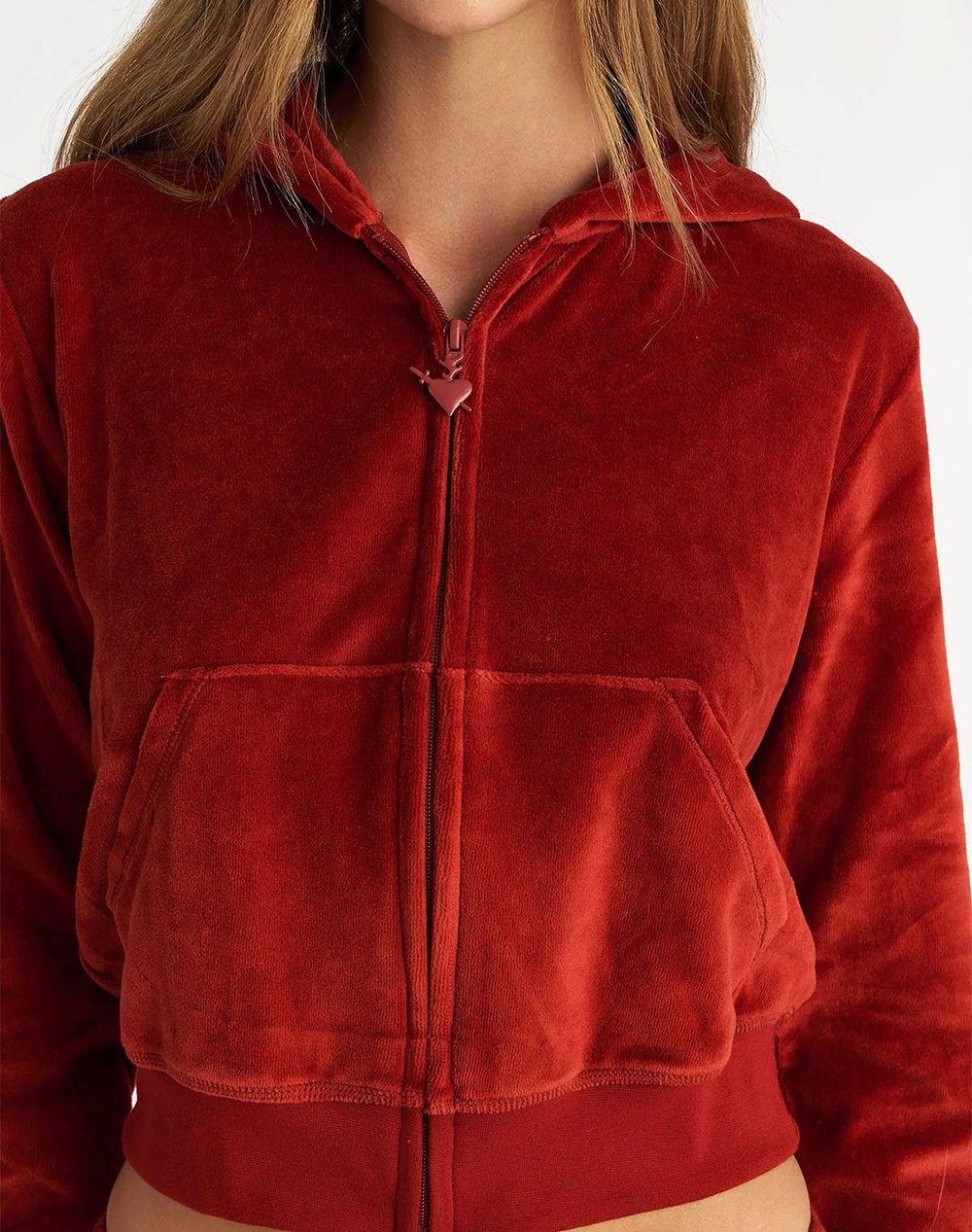 Women's velvet cardigan, in a comfortable fit, long sleeves, with a hood, front pockets and strass details on the back. Closes at the front with a zipper. (Composition: 80% Cotton, 20% Polyester)