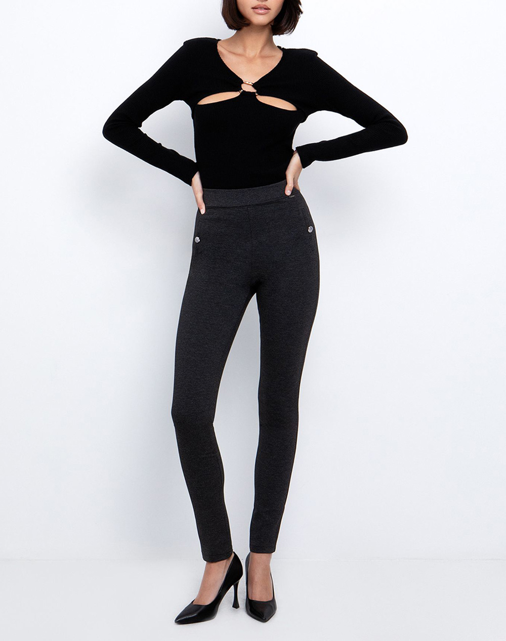 Women's blouse, fitted, long-sleeved, with a V-neckline and a design with cuts and a metallic element. (Composition: 48% Viscose, 27% Polyester, 20% Polyamide, 5% Elastane)