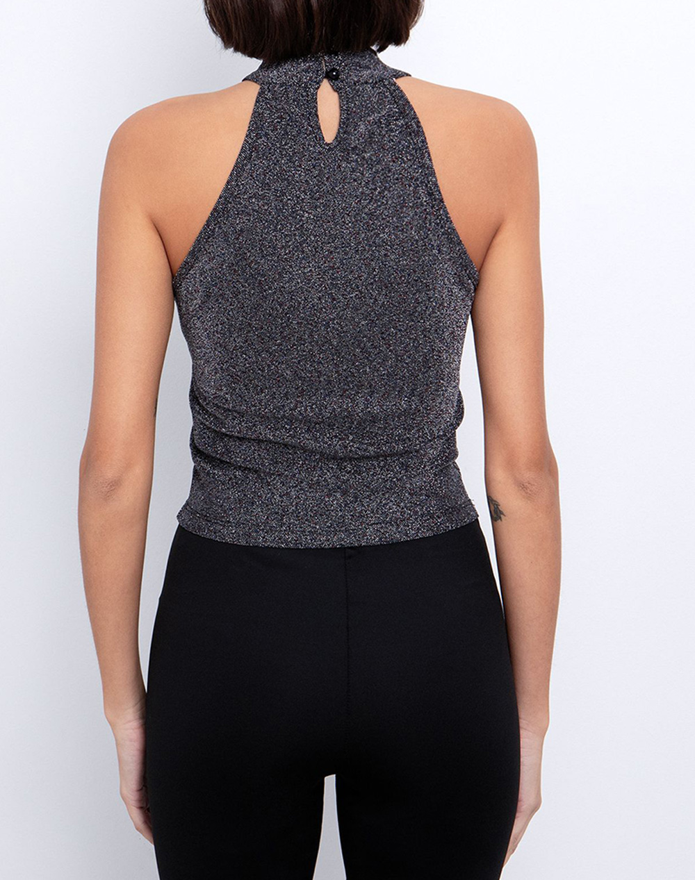 Women's blouse, regular fit, sleeveless, with high neck, shiny weave and button closure at the back. (Composition: 62% Polyamide, 34% Metallic Fibers, 4% Elastane)