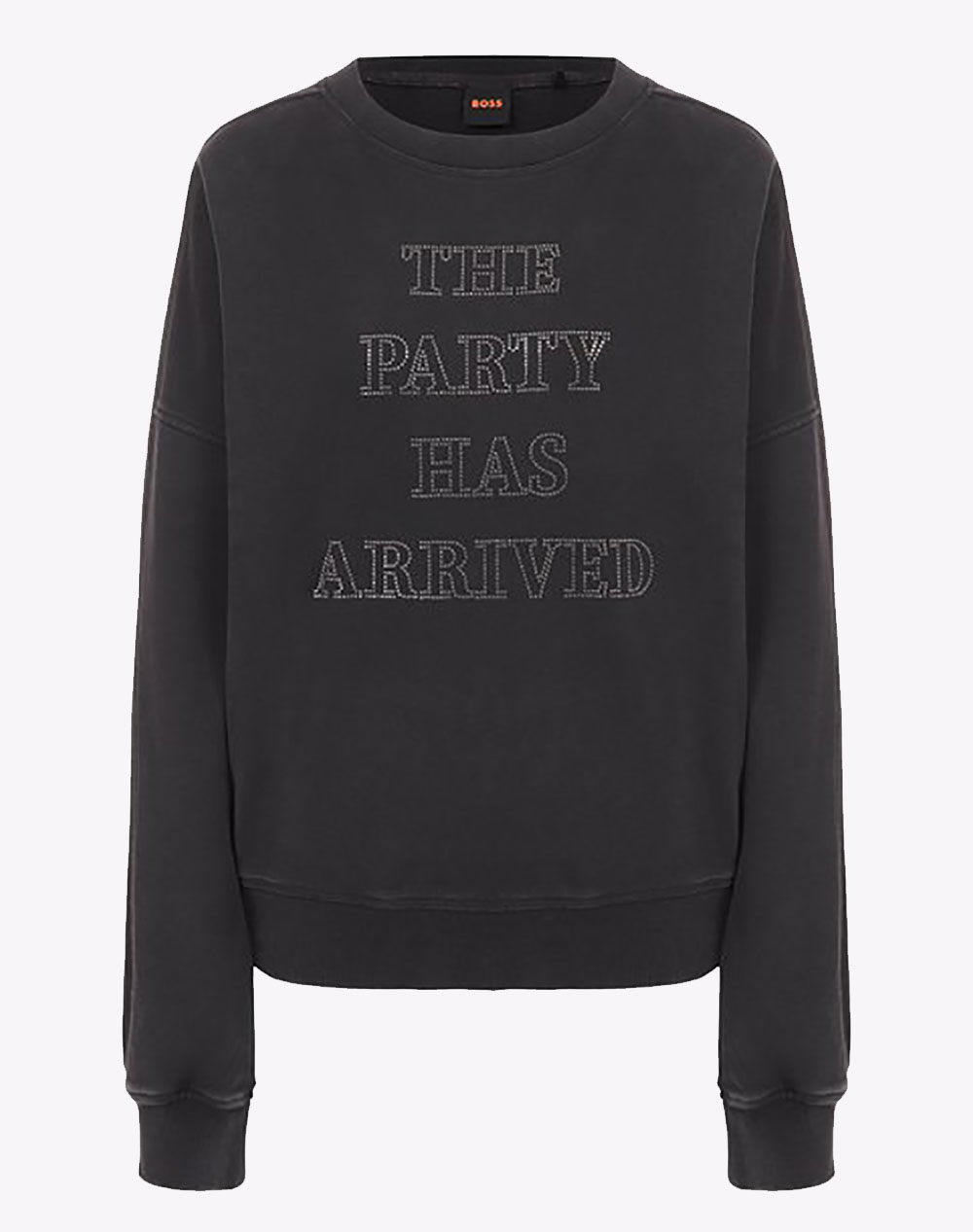 Women's sweatshirt, oversized, long-sleeved, with round neckline and strass lettering on the front. (Composition: 100% Cotton)