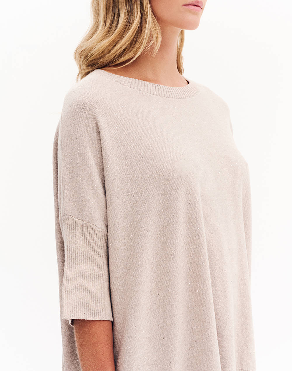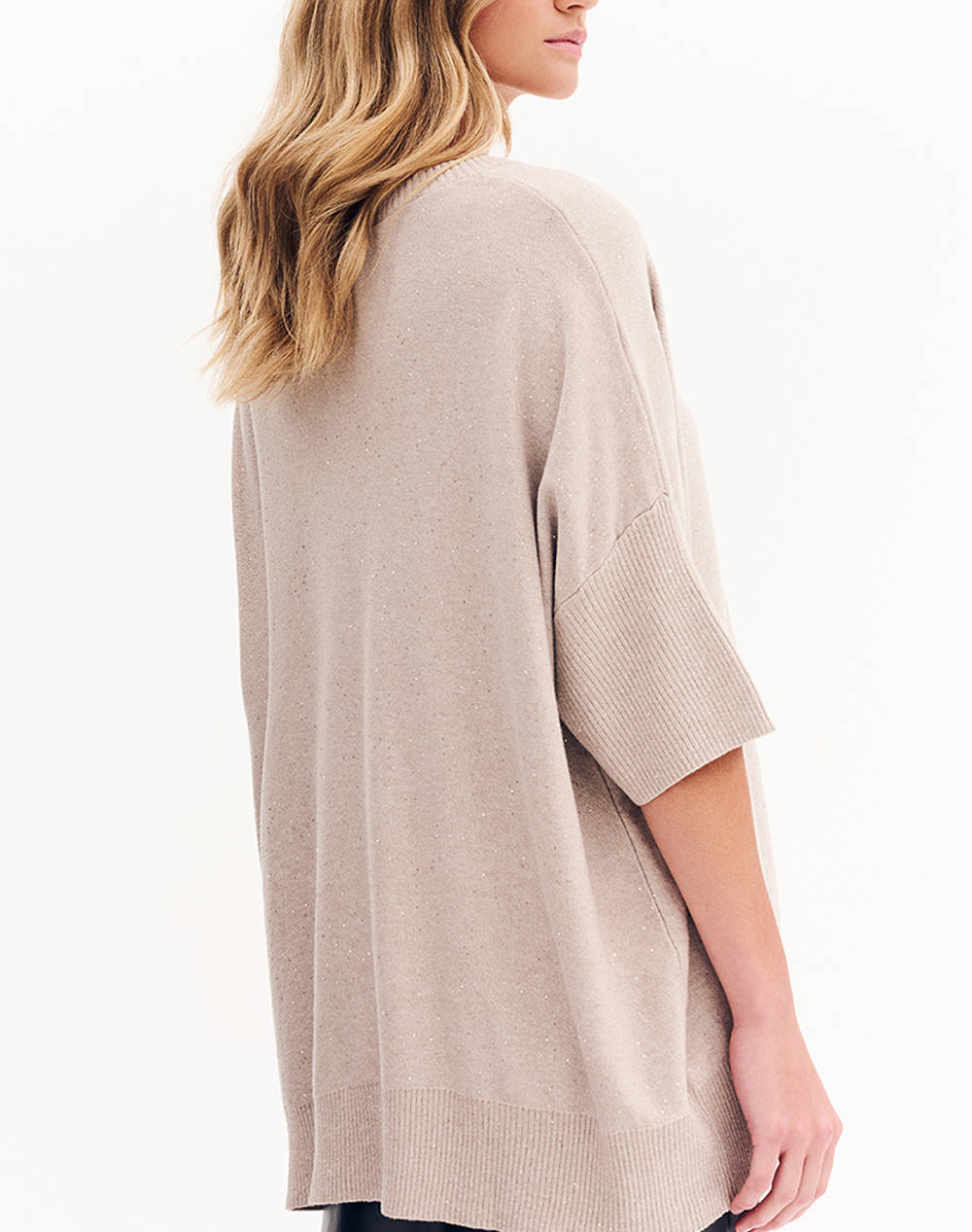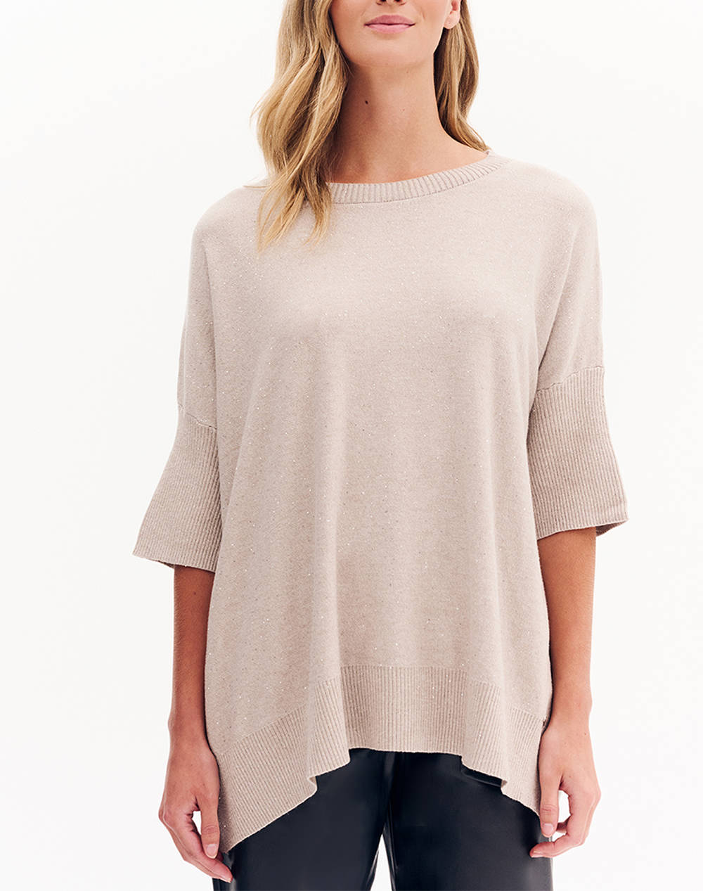 Women's knitted top, in a comfortable fit, with 3/4 sleeves, round neckline and a design with fine sequins. (Composition: 47% Viscose, 35% Polyester, 18% Polyamide)