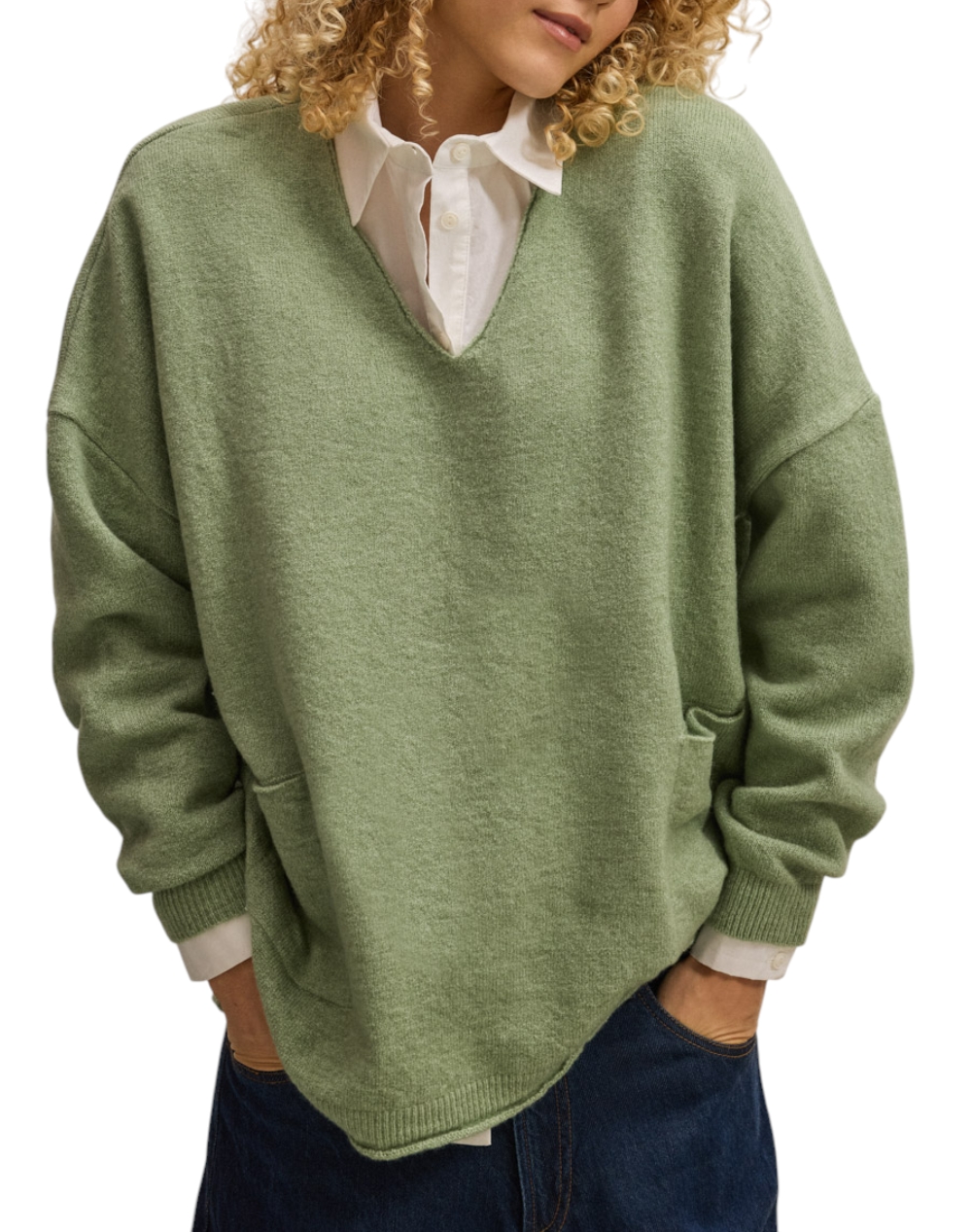 Γυναικεία πλεκτή μπλούζα, σε άνετη γραμμή, μακρυμάνικη, με τσέπες μπροστά και "V" λαιμόκοψη. (Σύνθεση: 80% Ακρυλικό, 18% Πολυεστέρας, 2% Ελαστάνη)