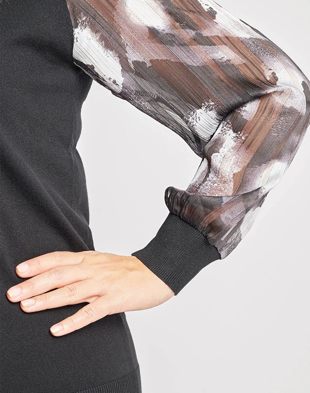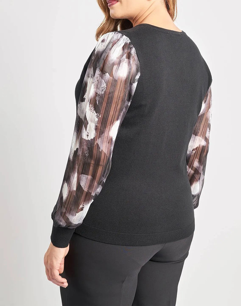 Γυναικεία πλεκτή μπλούζα, σε ίσια γραμμή, μακρυμάνικη, με V ντεκολτέ και ημιδιάφανα balloon μανίκια.(Σύνθεση: 80% Βισκόζη, 20% Πολυαμίδιο)