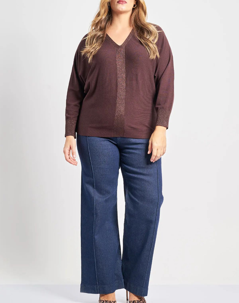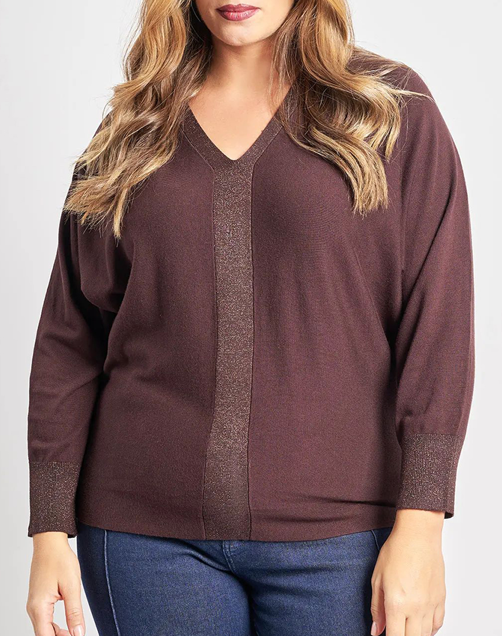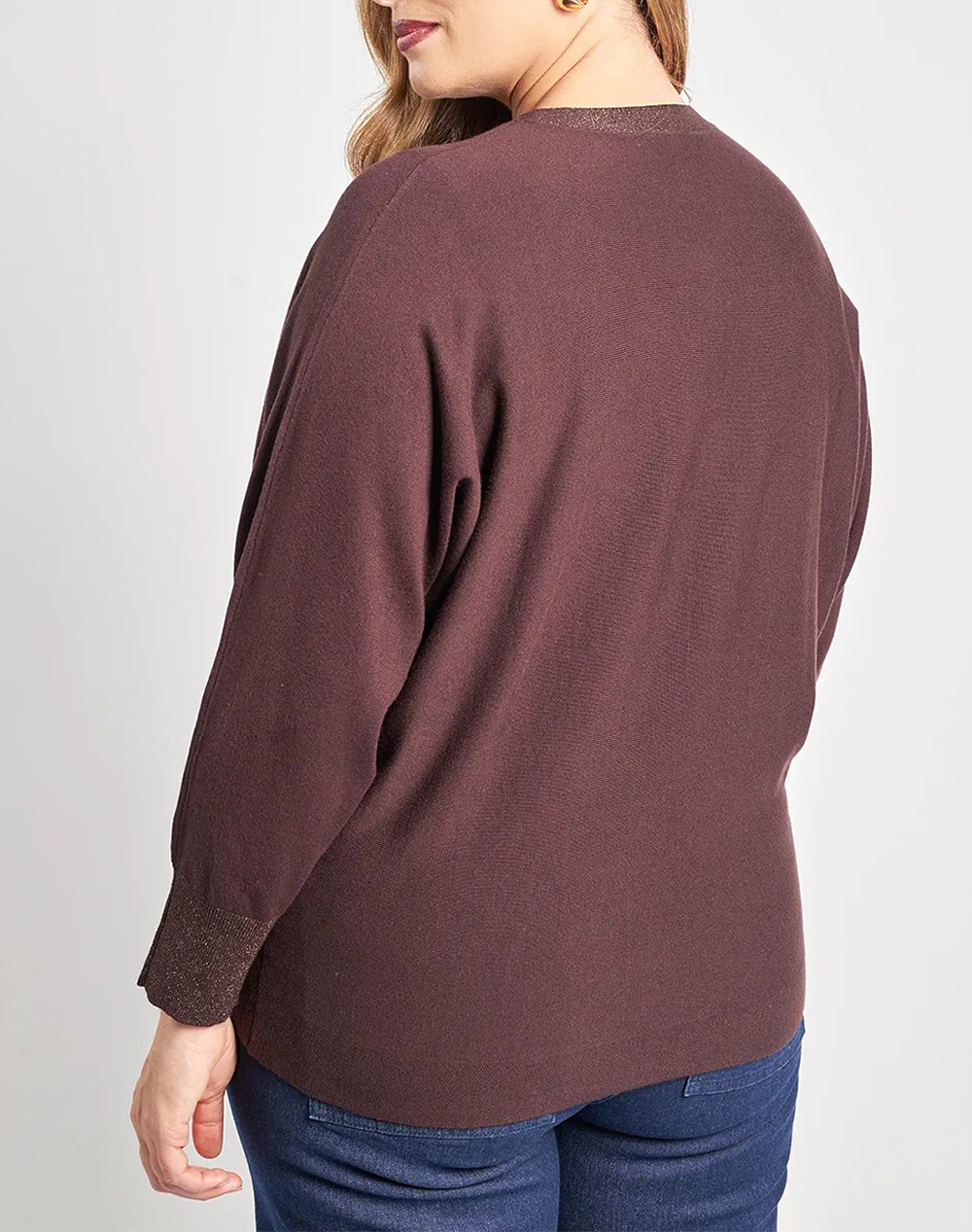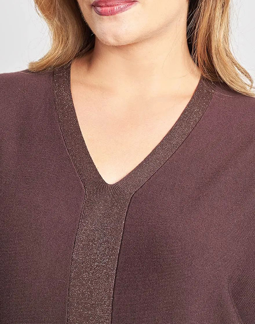 Γυναικεία πλεκτή μπλούζα, μακρυμάνικη, με V λαιμόκοψη και λεπτομέρειες lurex μπροστά και στις μανσέτες..(Σύνθεση: 80% Βισκόζη, 17% Πολυαμίδιο, 3% Metallized)