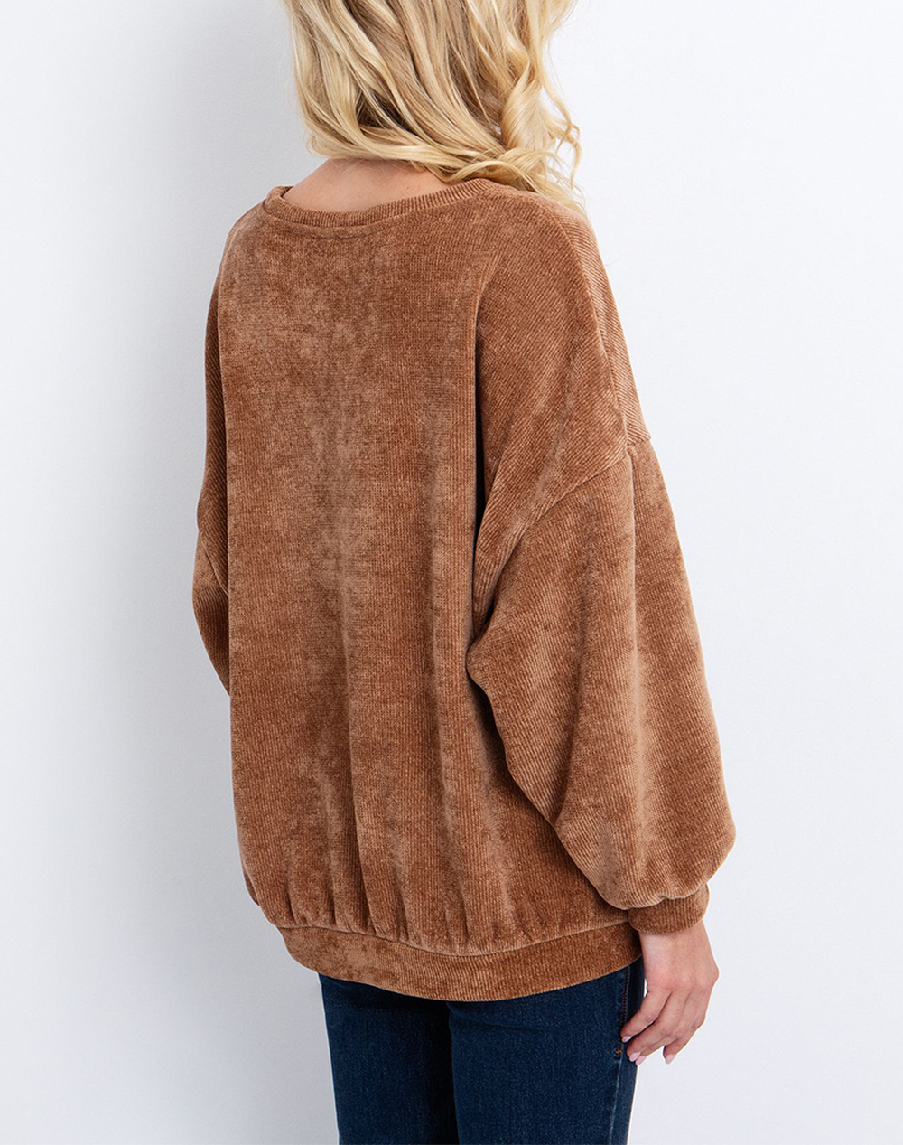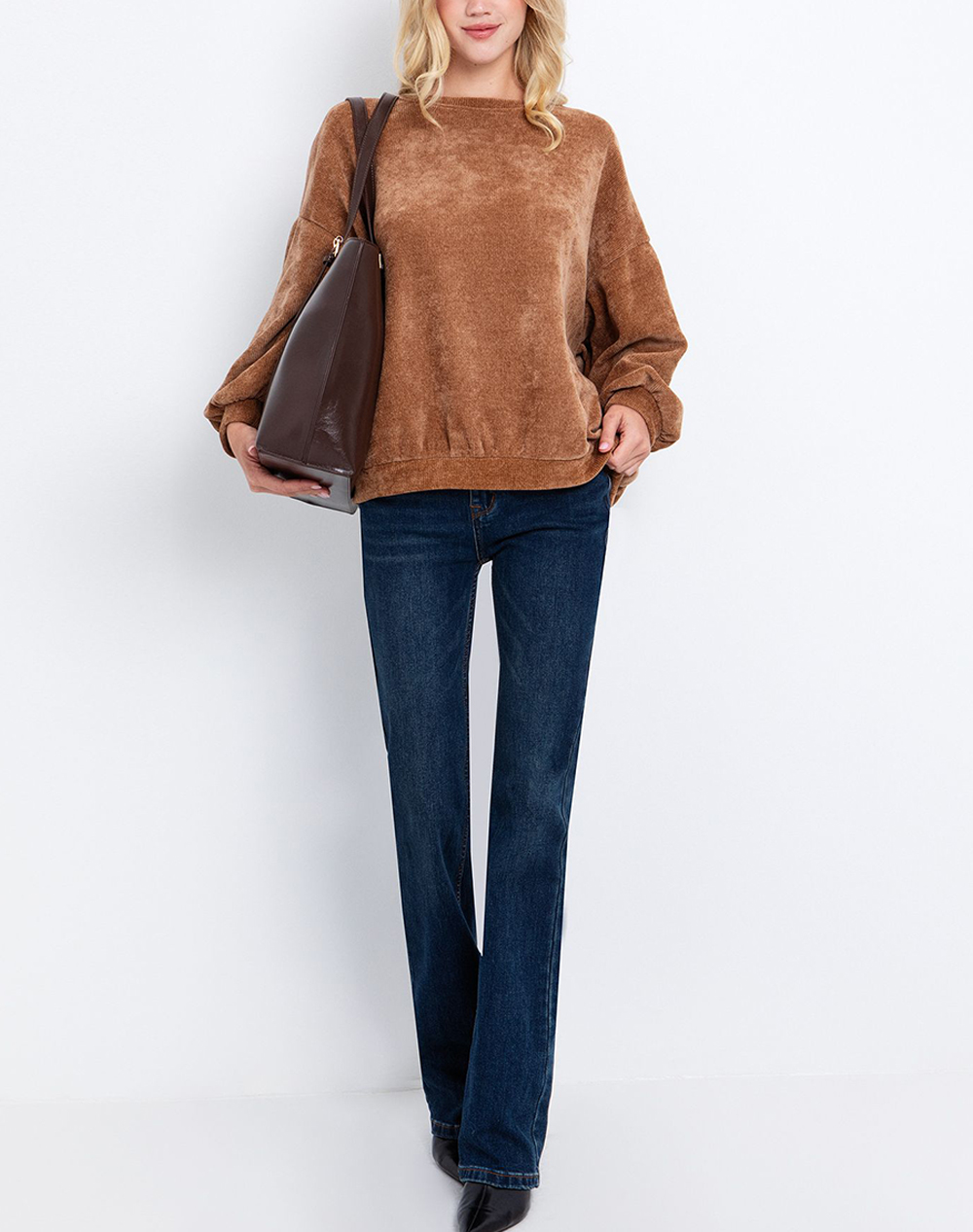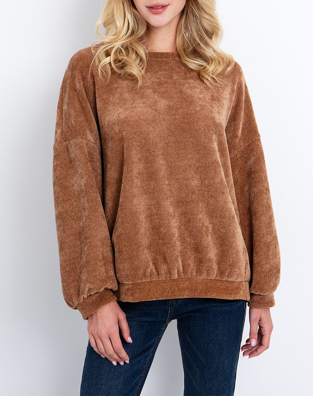 Women's blouse, in a loose fit, solid color, long sleeves, with a round neckline and a soft texture. (Composition: 100% Polyester)