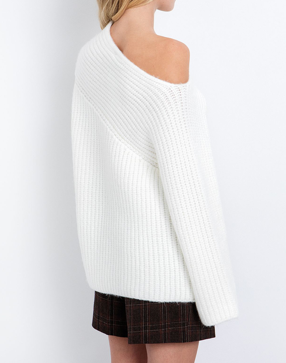 Women's sweater, loose fit, long sleeve, with asymmetrical neckline and exposed shoulder. (Composition: 82% Polycarbonates, 18% Polyester)