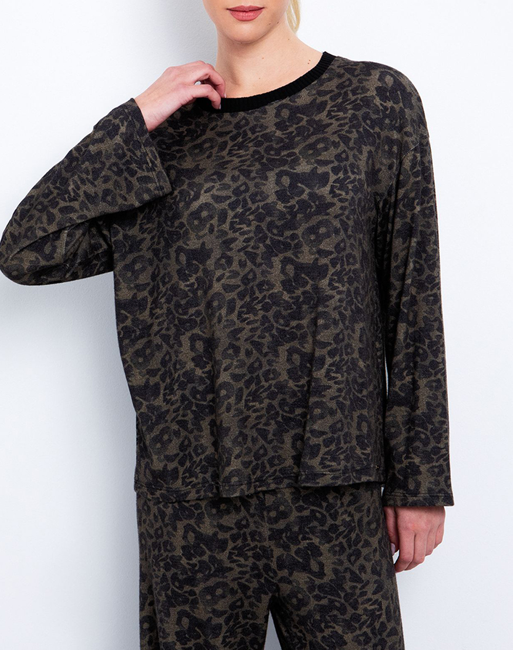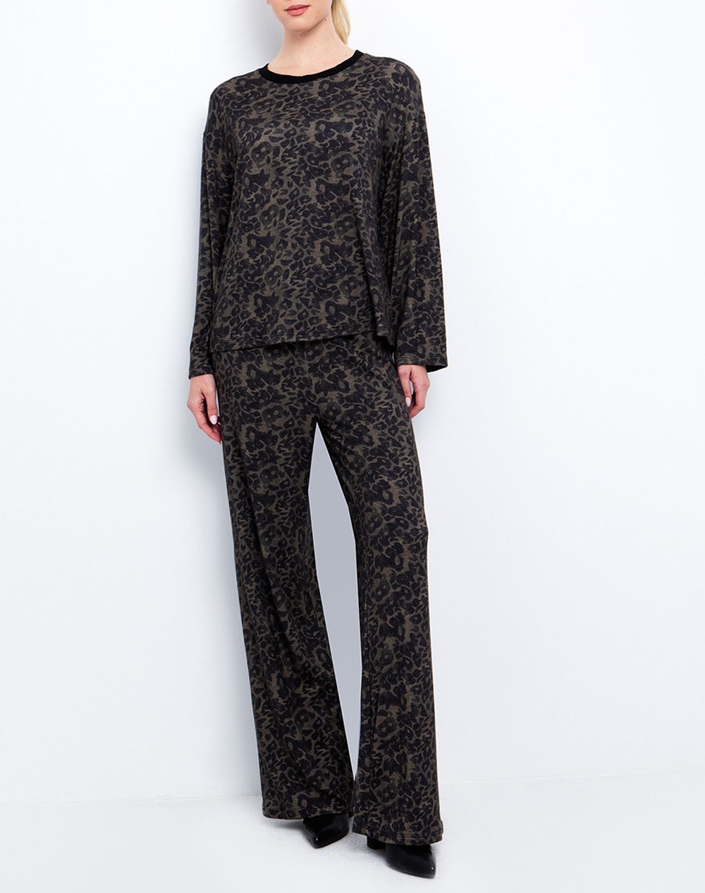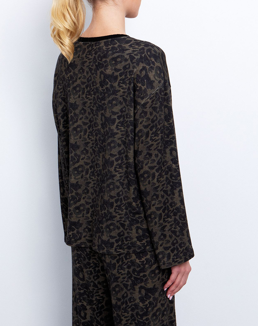 Γυναικεία πλεκτή μπλούζα, σε άνετη γραμμή, μακρυμάνικη, με animal-print μοτίβο, στρογγυλή λαιμόκοψη και φαρδιά μανίκια. (Σύνθεση: 50% Βισκόζη, 25% Πολυαμίδιο, 20% Πολυεστέρας, 5% Ελαστάνη)