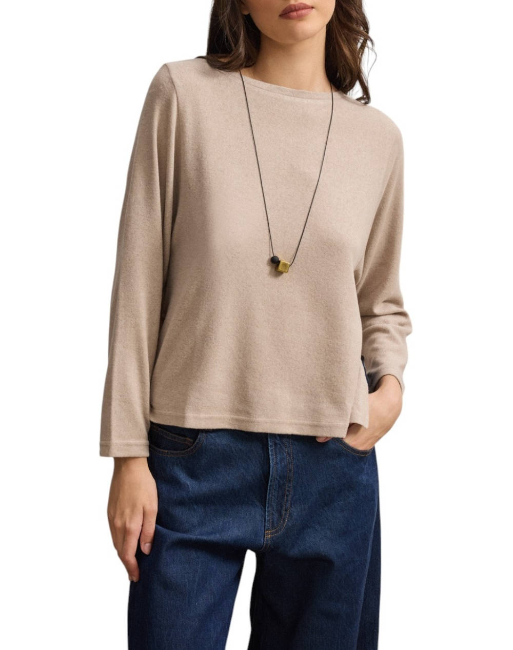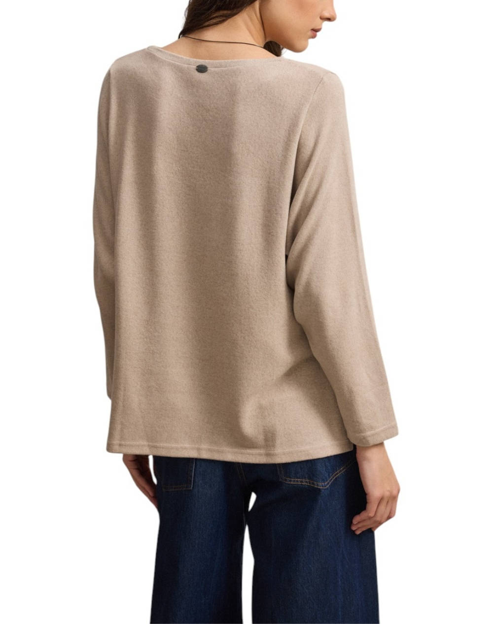Γυναικεία μπλούζα, σε άνετη γραμμή, μονόχρωμη, μακρυμάνικη, με στρογγυλή λαιμόκοψη, ασύμμετρο τελείωμα και ανοίγματα στα πλαϊνά. (Σύνθεση: 80% Βισκόζη, 16% Πολυέστερας, 4% Ελαστάνη)