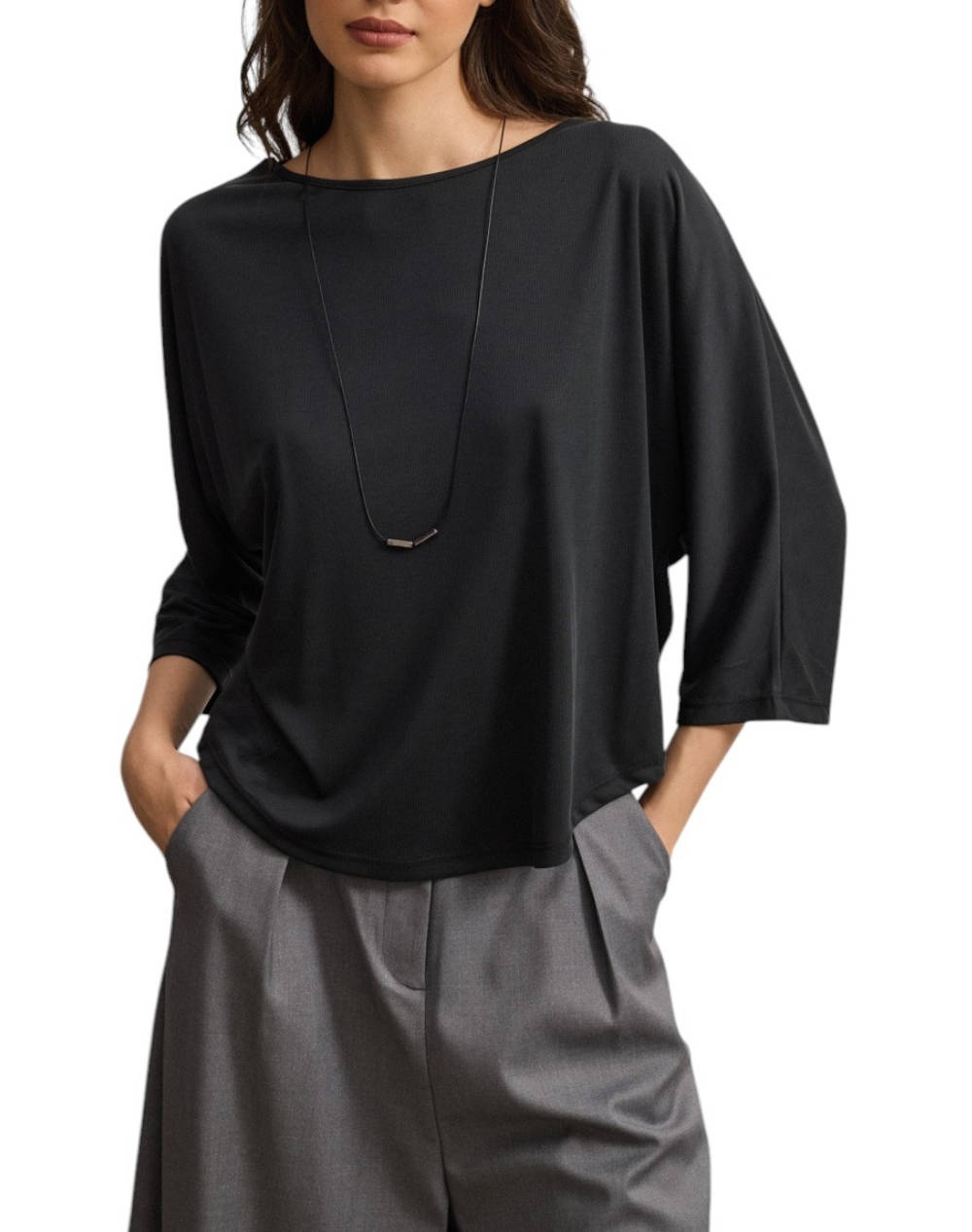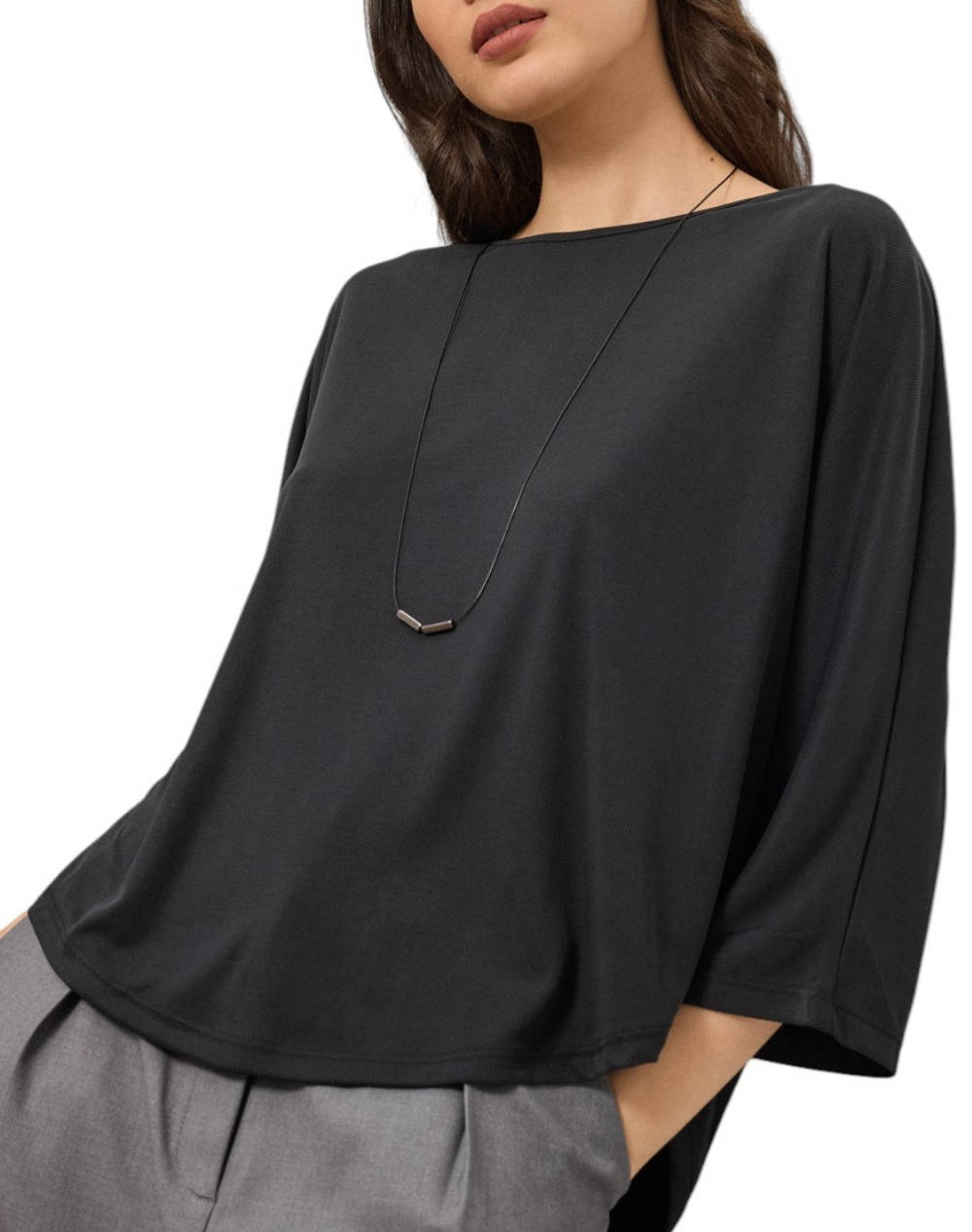 Γυναικεία μπλούζα, σε άνετη γραμμή, μονόχρωμη, μακρυμάνικη, με στρογγυλή λαιμόκοψη και διακοσμητικό κολιέ . (Σύνθεση: 68% Μοντάλ, 32% Πολυεστέρας)