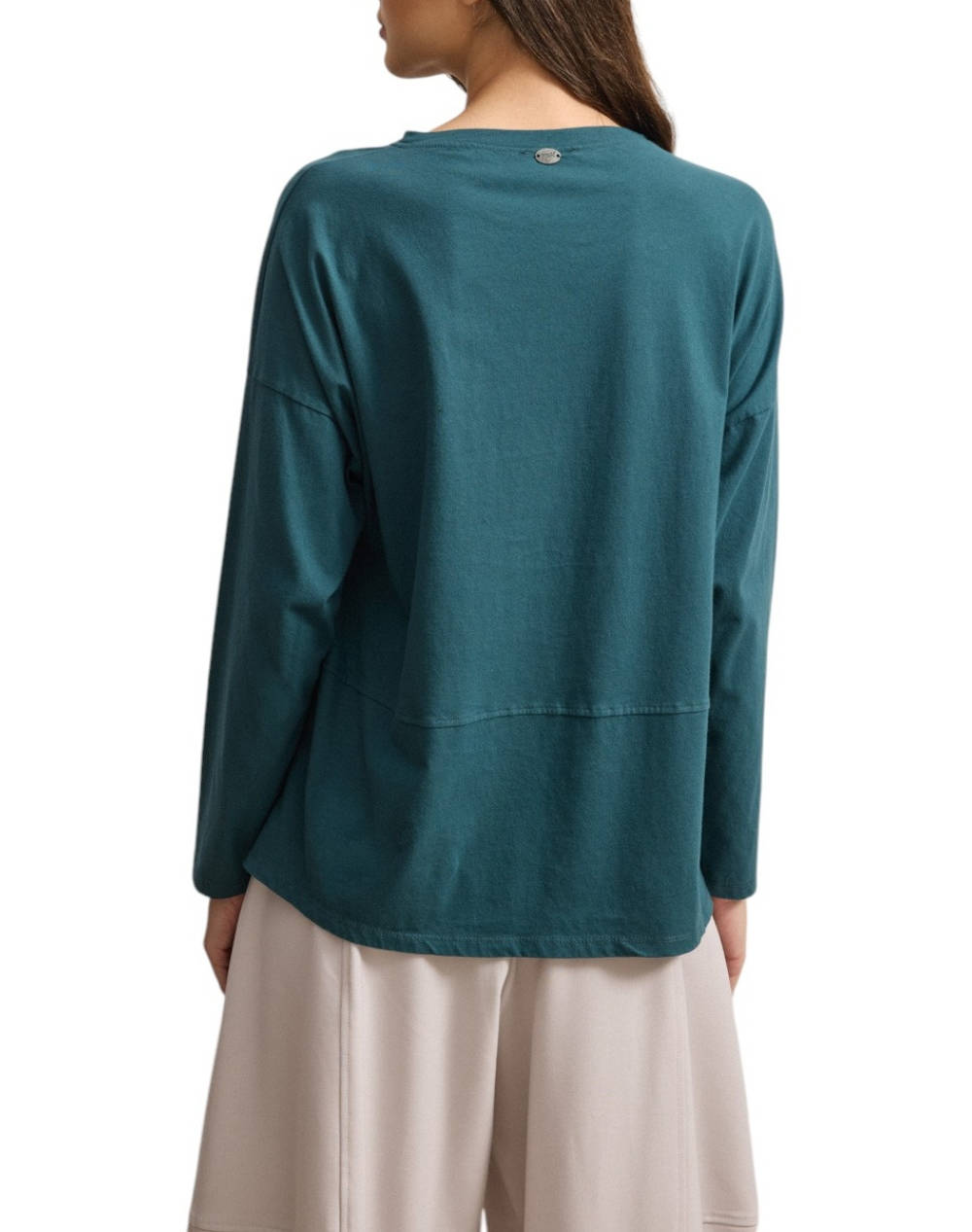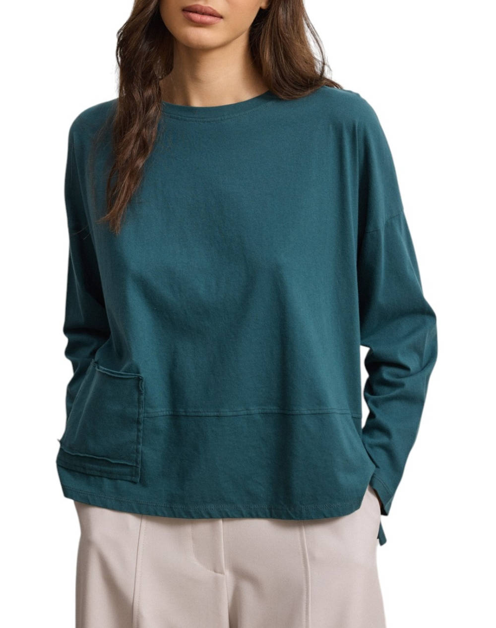 Γυναικεία μπλούζα, μονόχρωμη, μακρυμάνικη, με διπλή μπροστινή τσέπη, ασύμμετρο τελείωμα και στρογγυλή λαιμόκοψη. (Σύνθεση: 100% Βαμβάκι)