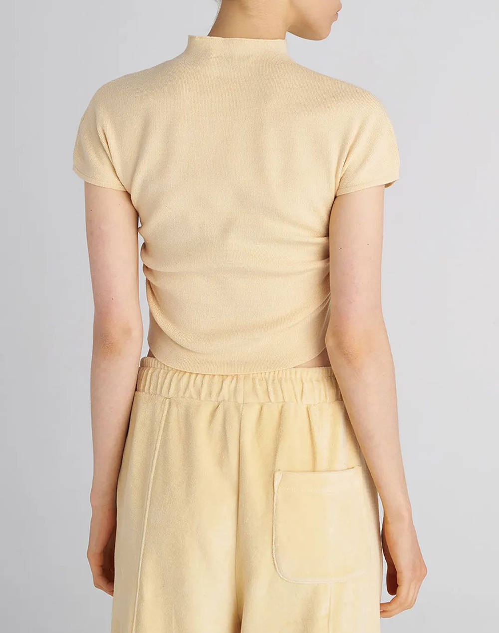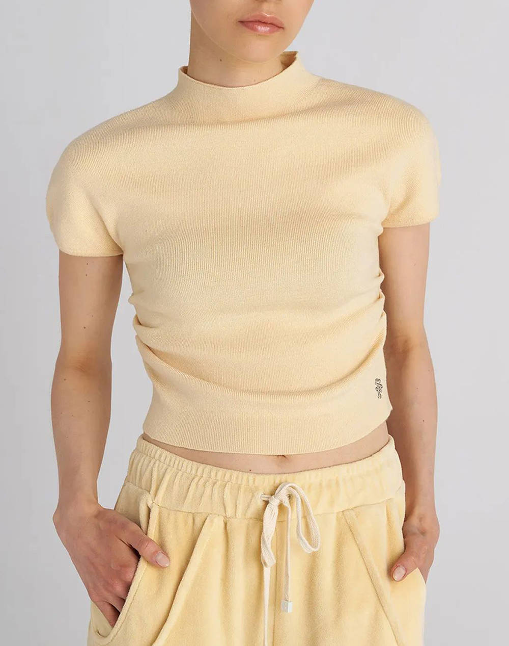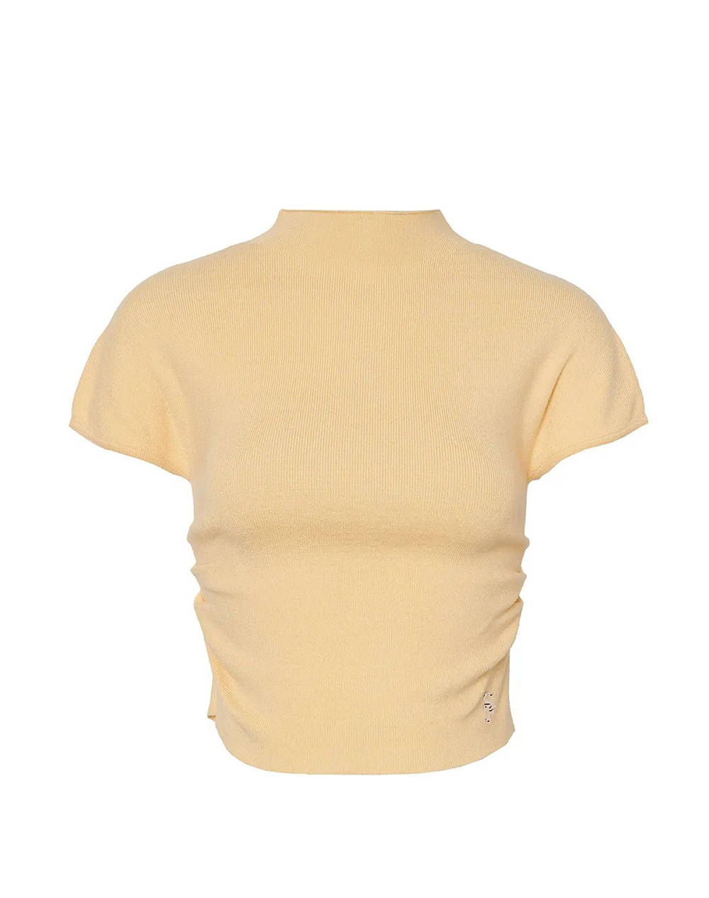 Γυναικεία πλεκτή μπλούζα, σε στενή γραμμή, κοντομάνικη, μονόχρωμη, με ψηλή λαιμόκοψη και σούρες στα πλαϊνά.(Σύνθεση: 50% Βισκόζη, 22% Πολυπροπυλένιο, 28% Πολυεστέρας)