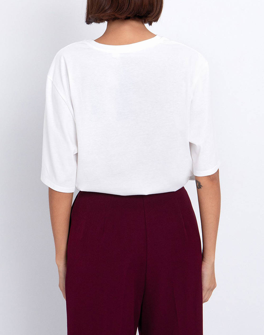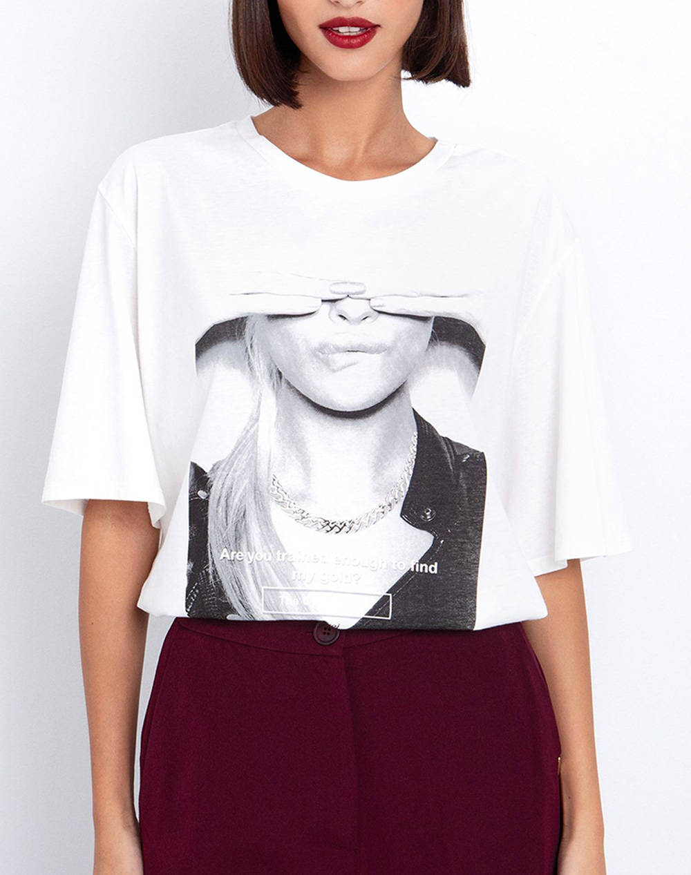 Γυναικεία μπλούζα, σε άνετη γραμμή, μονόχρωμη, κοντομάνικη, με τύπωμα μπροστά και στρογγυλή λαιμόκοψη.(Σύνθεση: 100% Βαμβάκι)