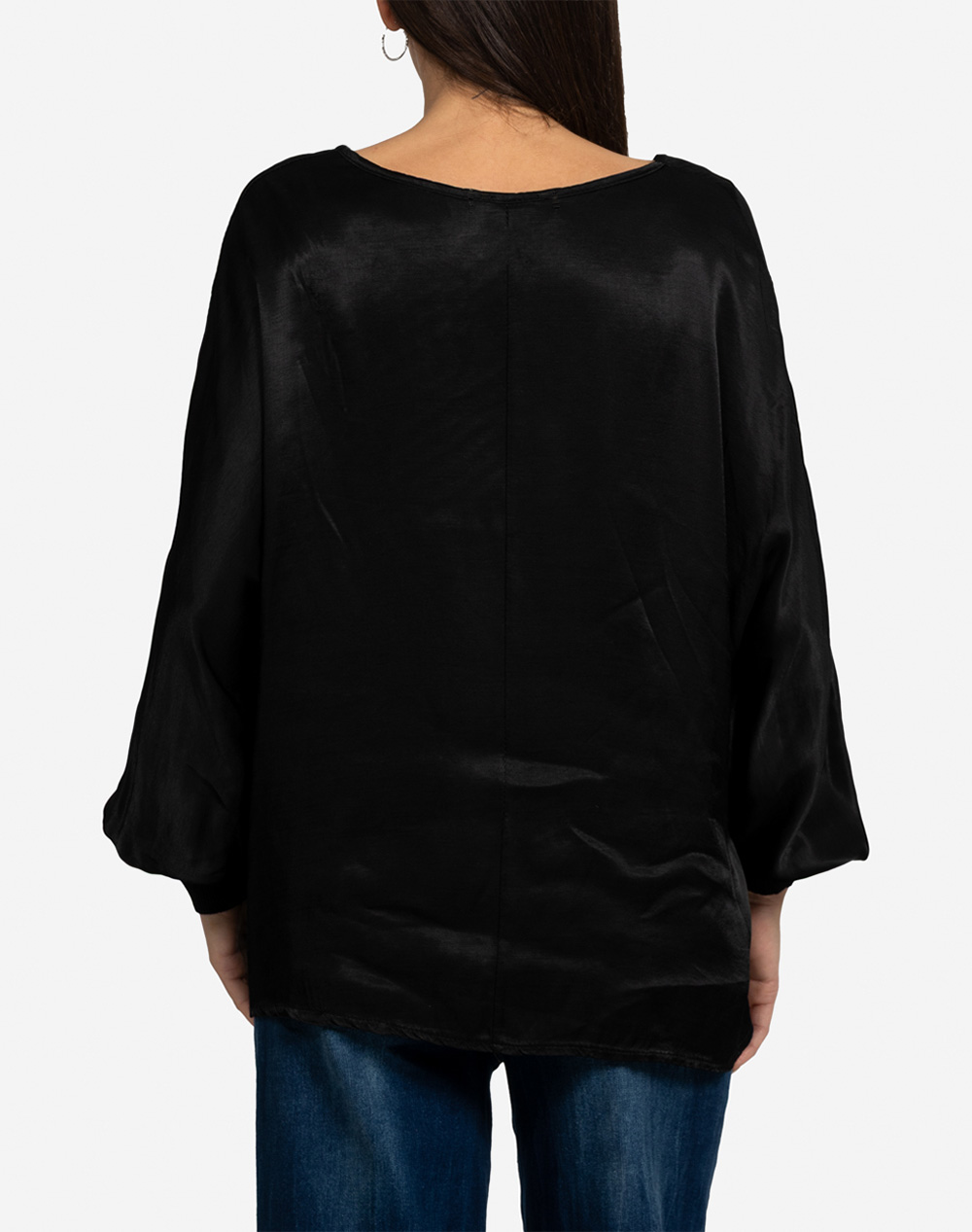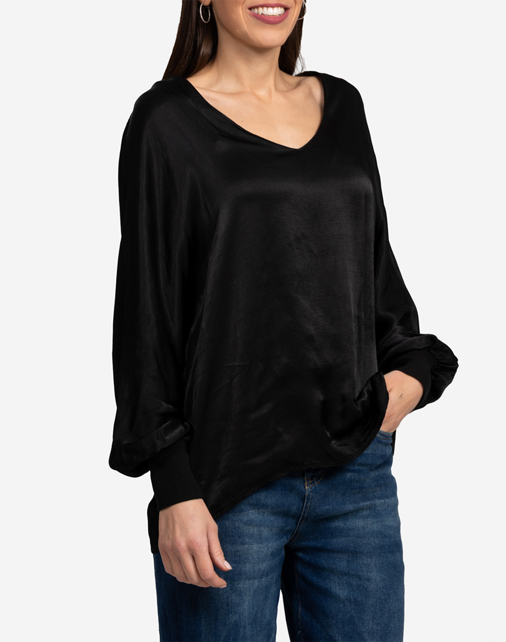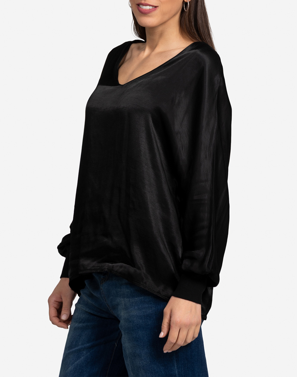 Γυναικεία μπλούζα, σε χαλαρή γραμμή, μακρυμάνικη, με ελαστικές rib μανσέτες, γυαλιστέρη, μεταξένια ύφανση και "V" λαιμόκοψη. Καλύπτει έως 110εκ. (Σύνθεση: 100% Βισκόζη)