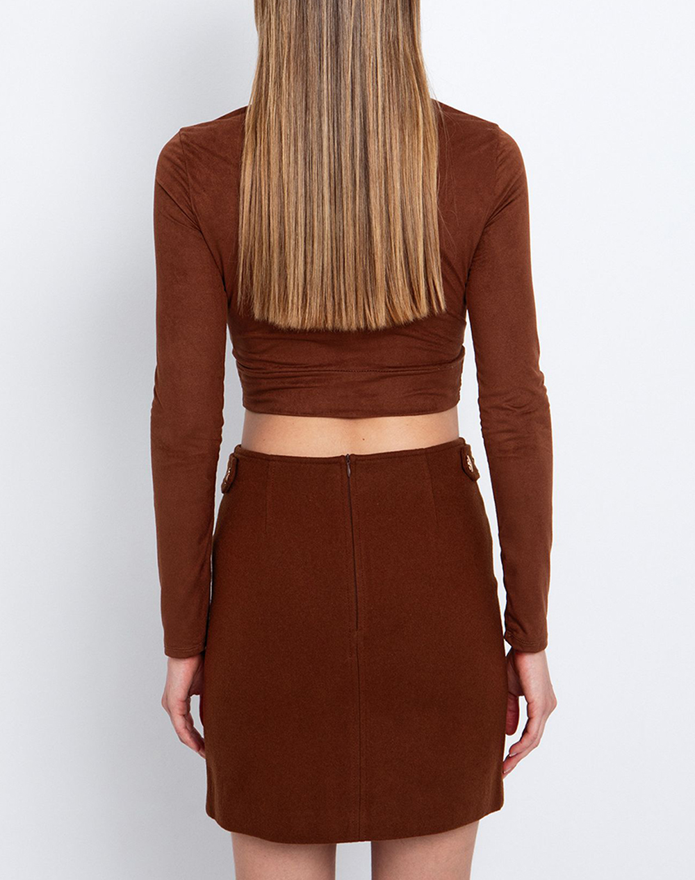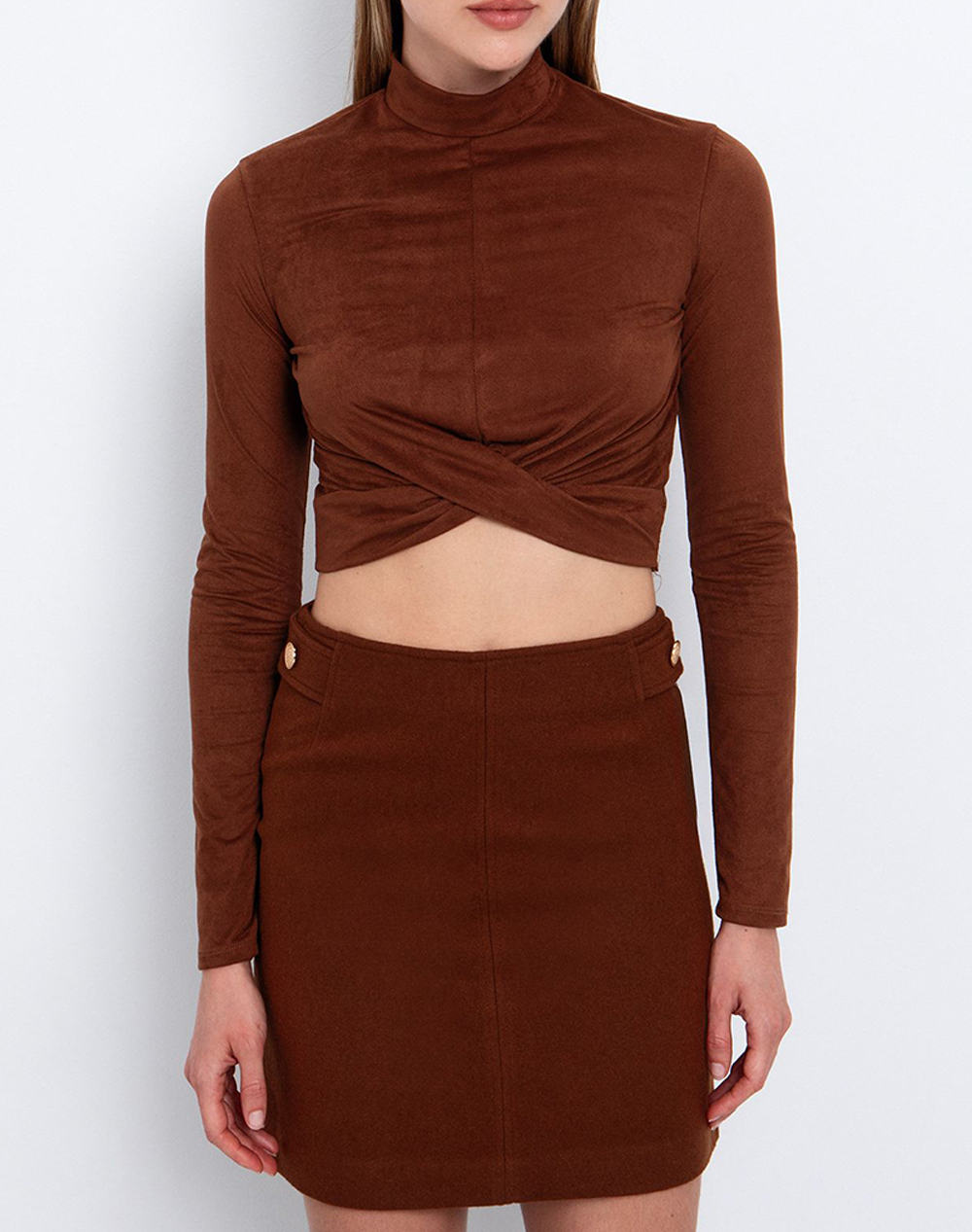 Women's crop top, fitted, long-sleeved, with a high neck and a criss-cross design at the bottom with draped details. (Composition: 88% Polyester, 12% Elastane)