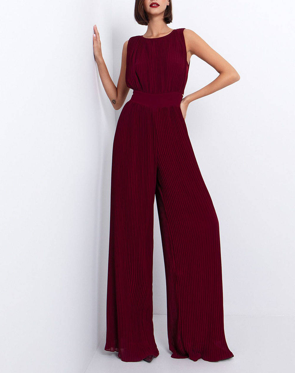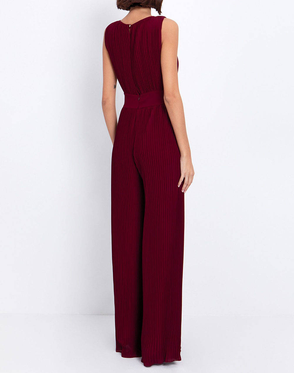 Women's jumpsuit, in a comfortable fit, solid color, sleeveless, with a pleated design, wide waistband and button closure at the collar and hidden zipper. (Composition: 100% Polyester)