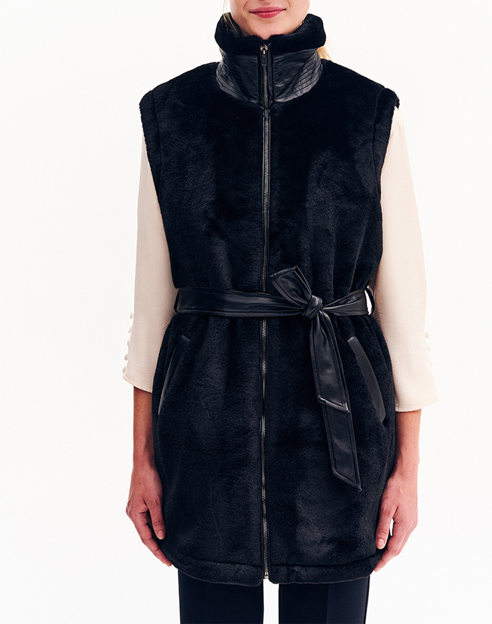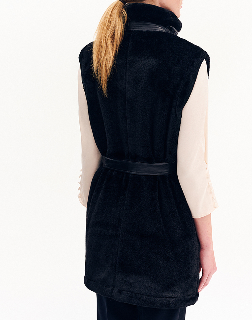 Women's fur vest, sleeveless, with a high neckline that opens into a collar. It closes with a zipper and has a belt made of eco-leather. (Composition: 100% Polyester)