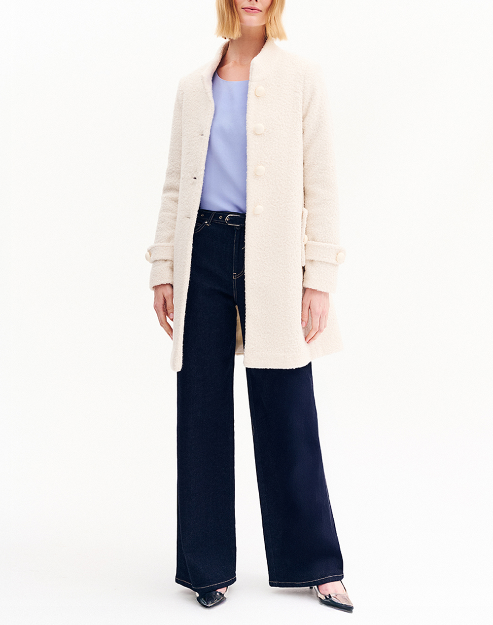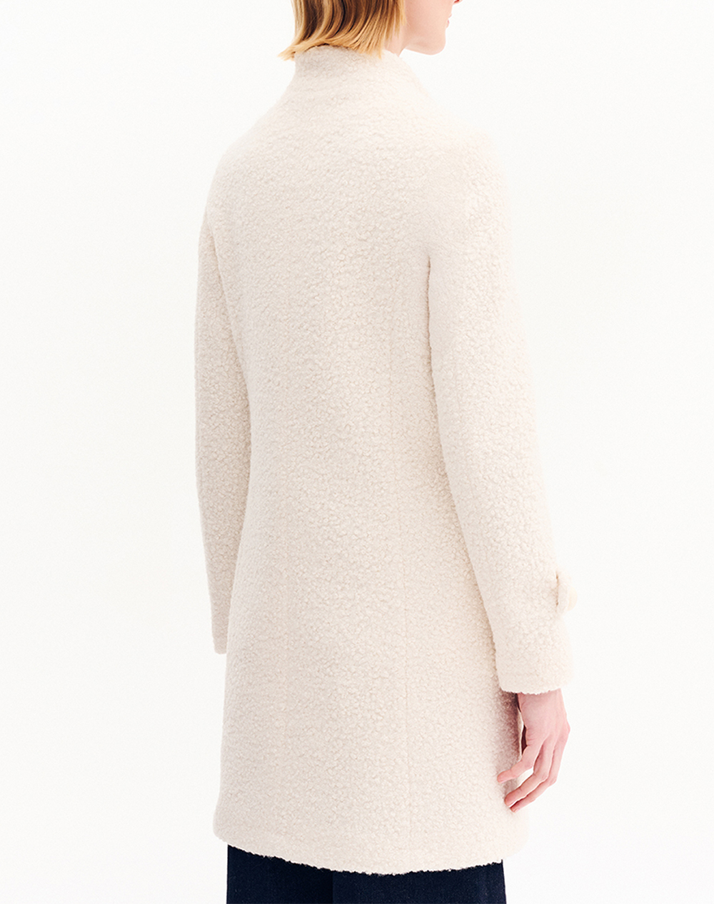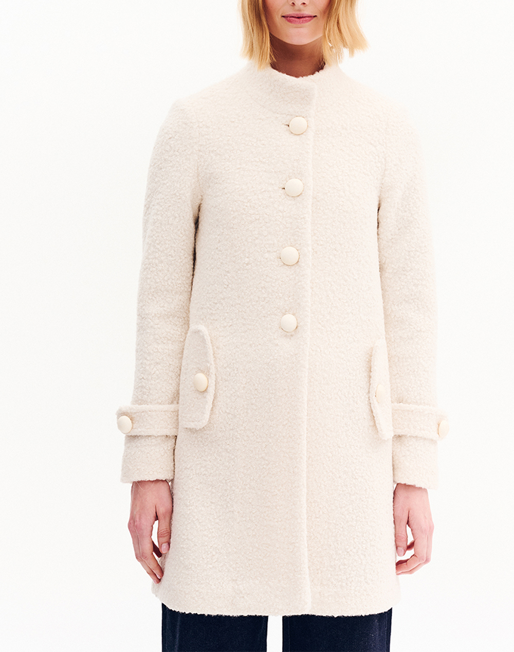 Women's bouclé coat, regular fit, solid color, with stand-up collar and front button closure. (Composition: 100% Polyester)