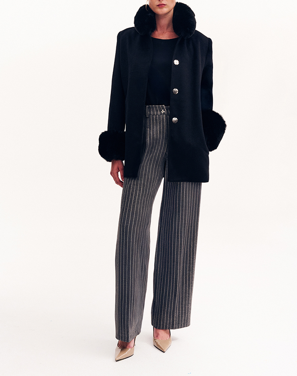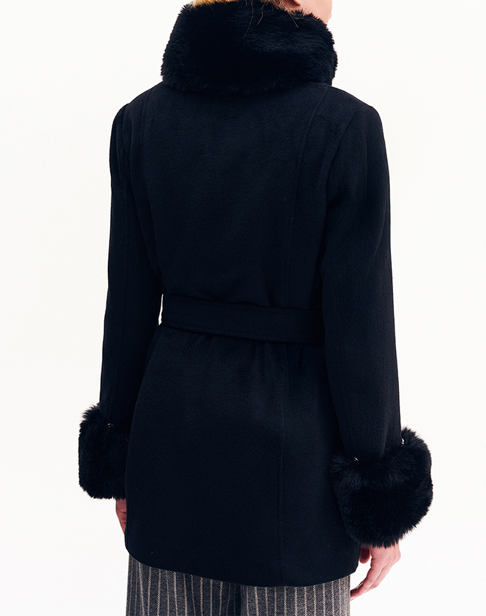 Γυναικείο κοντό παλτό, με λεπτομέρεια αποσπώμενη γούνα στο γιακά και στις μανσέτες. Διαθέτει κοφτές τσέπες και ζώνη ίδιας ύφανσης στη μέση. (Σύνθεση: 90% Πολυεστέρας, 10% Μαλλί)