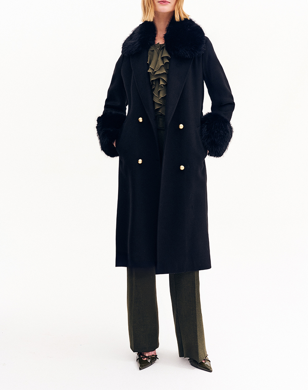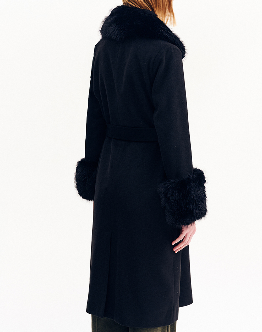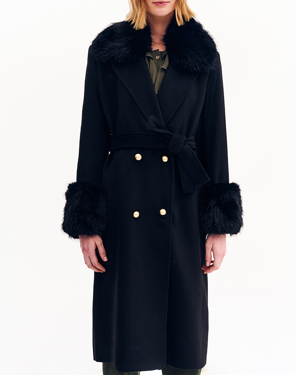 Γυναικείο μακρύ παλτό, με λεπτομέρεια αποσπώμενη γούνα στο γιακά και στις μανσέτες. Διαθέτει κοφτές τσέπες και ζώνη ίδιας ύφανσης στη μέση. (Σύνθεση: 70% Πολυεστέρας, 30% Μαλλί)