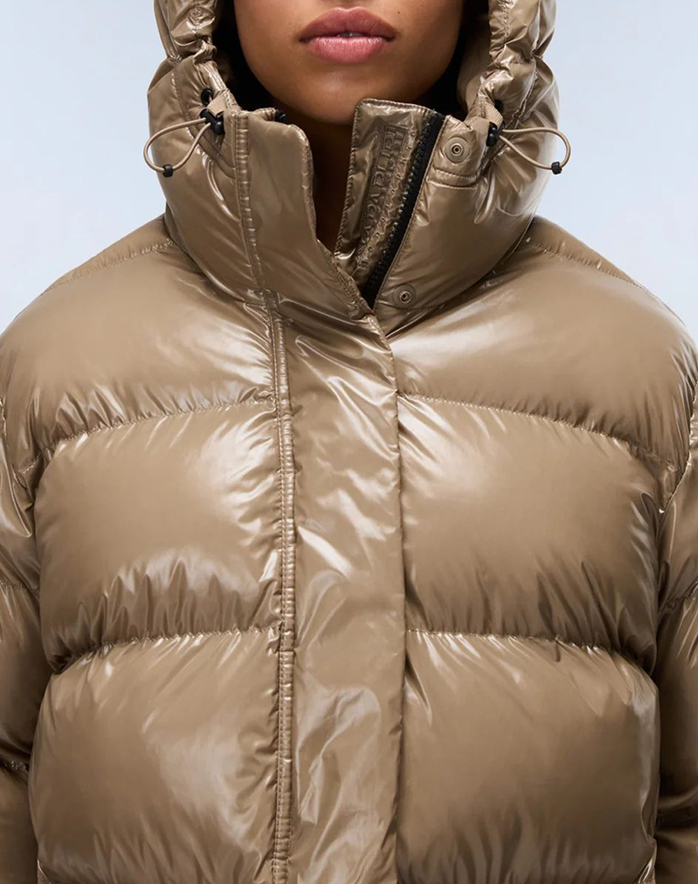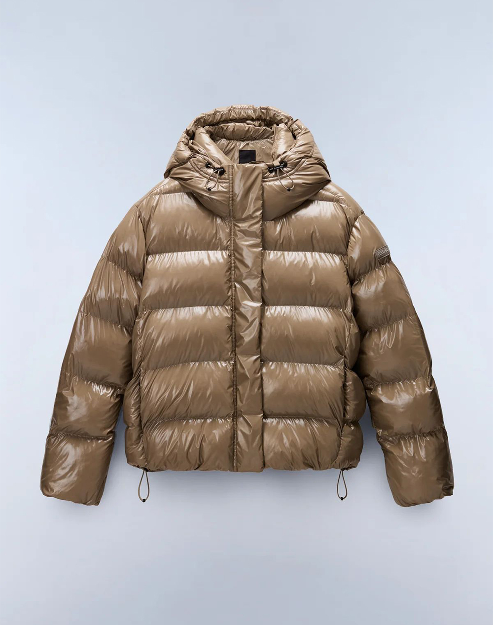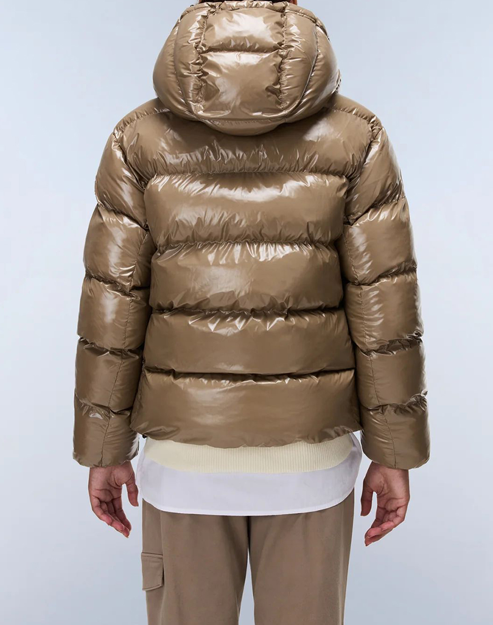 Women's short puffer jacket made of synthetic material.