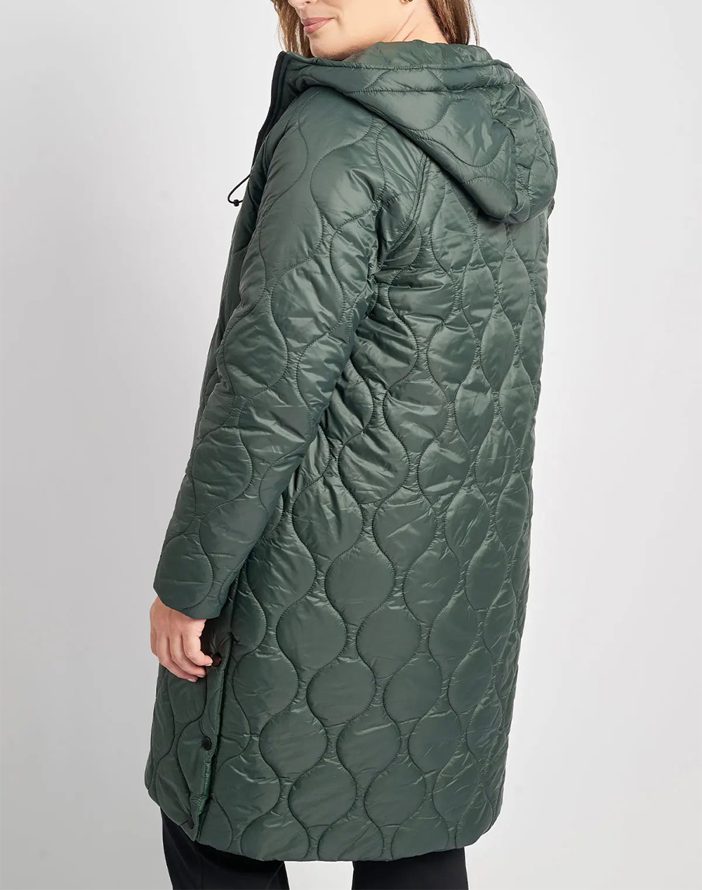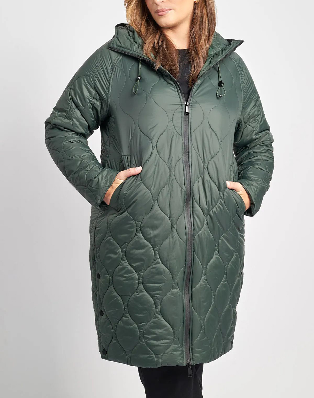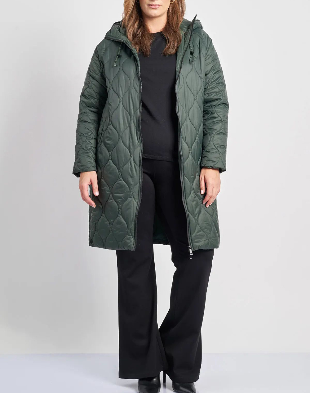 Women's quilted jacket, waterproof, long-sleeved, long, straight-cut, with side pockets, hood and zipper closure along the length. (Composition: 100% Polyamide)