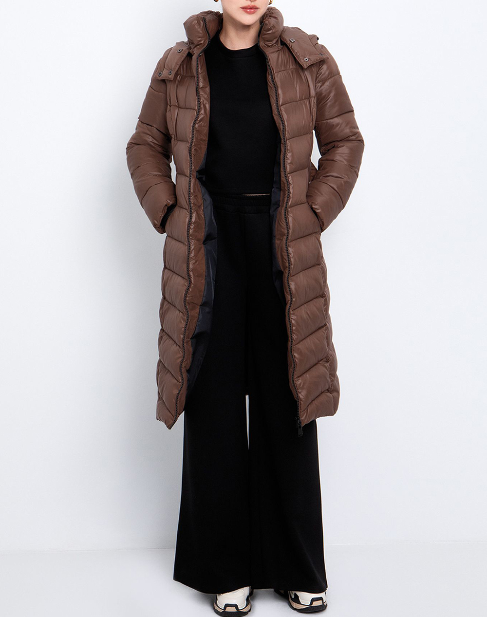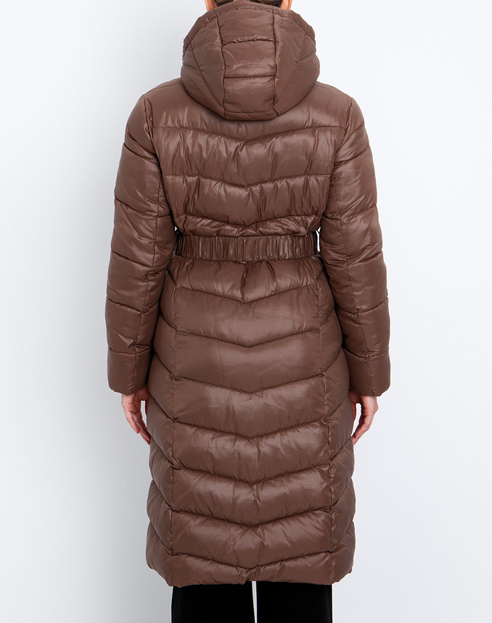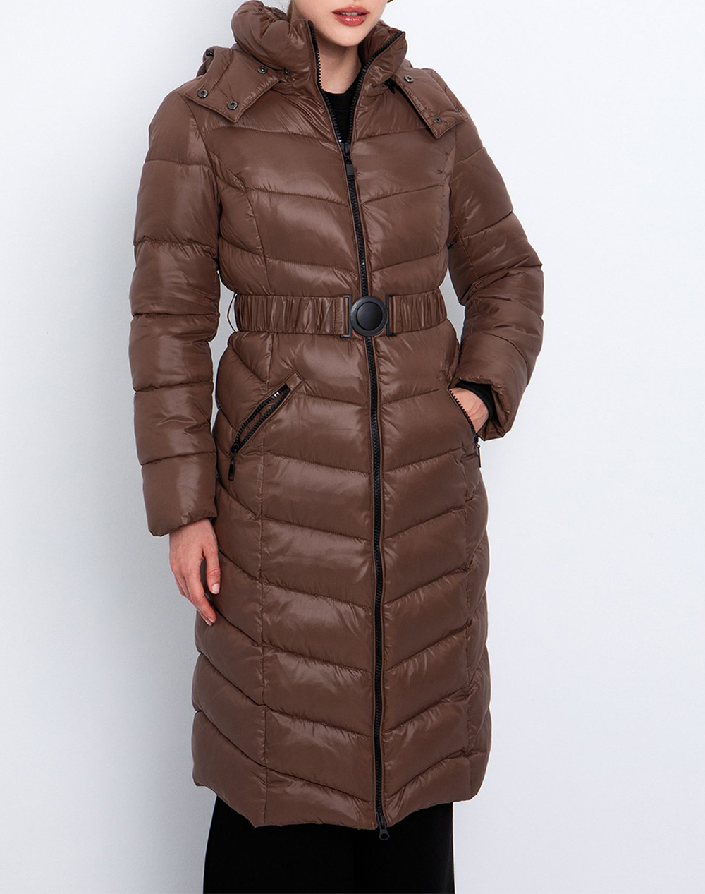 Γυναικείο μπουφάν, καπιτονέ, σε κανονική γραμμή, με αποσπώμενη κουκούλα, με ζώνη, πλαϊνές τσέπες και κλείσιμο κατά μήκος με φερμουάρ. (Σύνθεση: 100% Πολυαμίδιο)