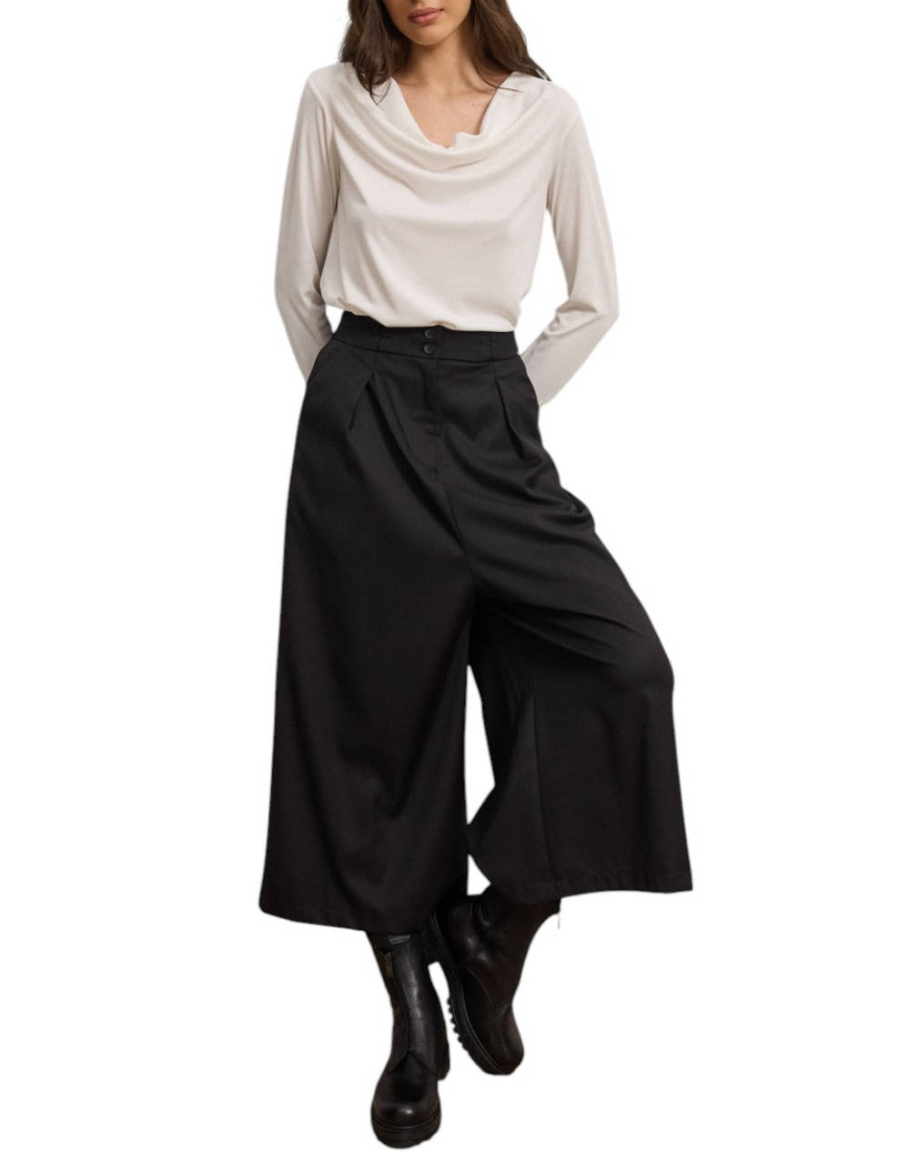 Γυναικέιο παντελόνι jupe culotte, ψηλόμεσο, σε φαρδιά γραμμή, μονόχρωμο, με τσέπες και κλείσμο με φερμουάρ και κουμπί. (Σύνθεση: 35% Ραγιόν, 62% πολυεστέρας, 3% Σπάντεξ)