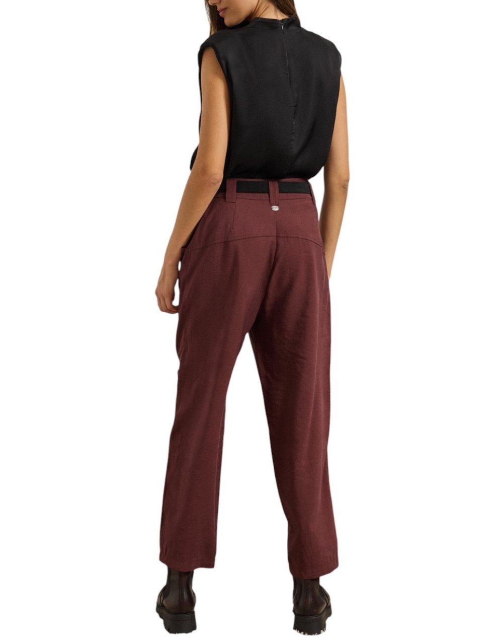Women's pants, solid color, high waist, straight cut, with pockets and front button closure. (Composition: 88% Viscose, 12% Polyester)