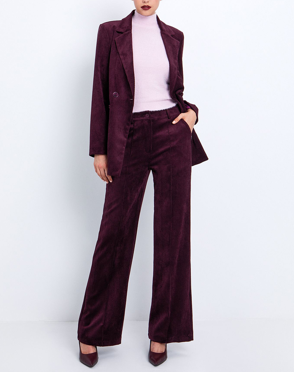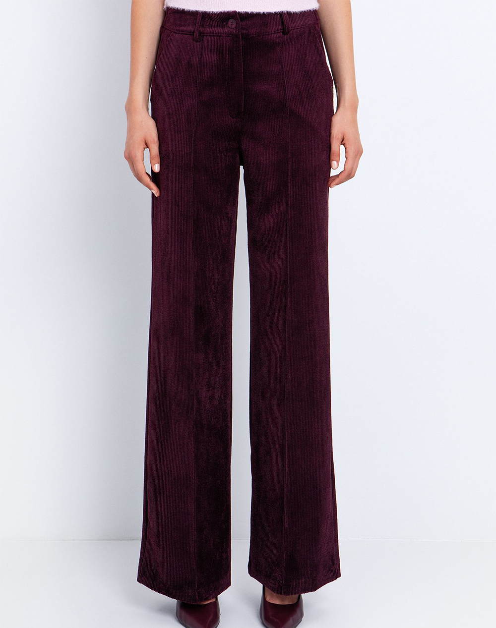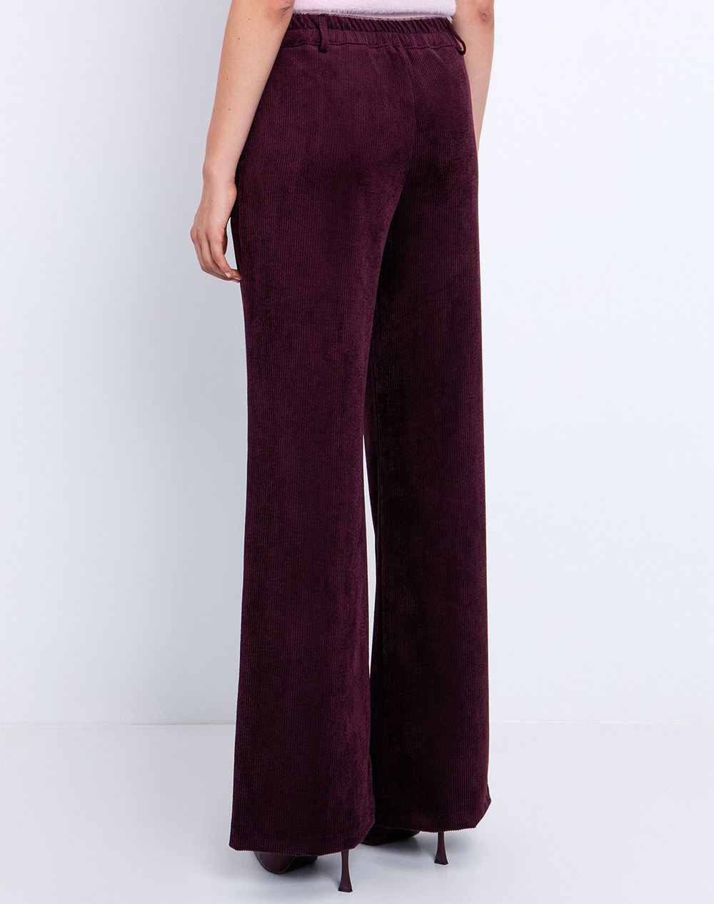 Women's trousers, regular fit, corduroy weave, side pockets, elastic waist and zipper and button closure. (Composition: 85% Polyester, 12% Polyamide, 3% Elastane)