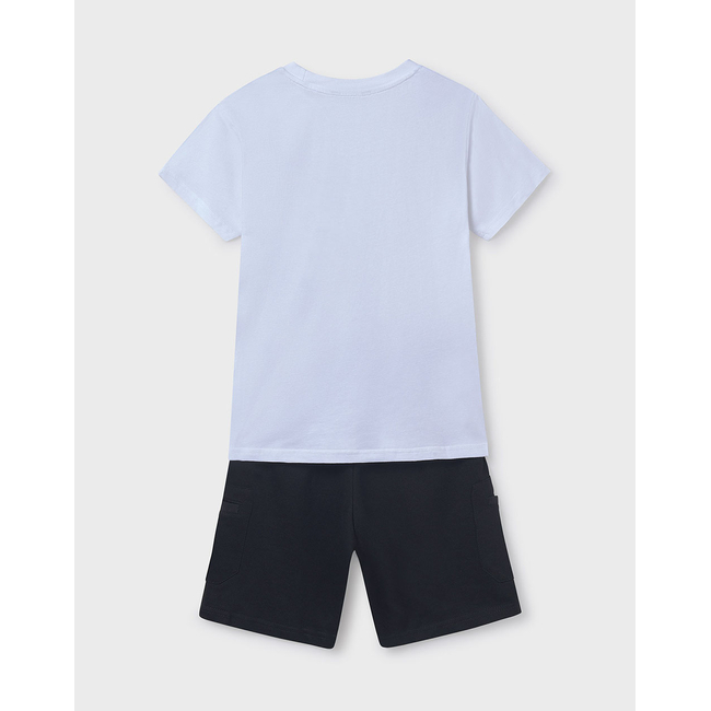 Kids' clothing set, with short-sleeved t-shirt with contrasting detail and solid-colored Bermuda shorts with drawstring at the waist. (Composition: 98% Cotton, 2% Polyamide)