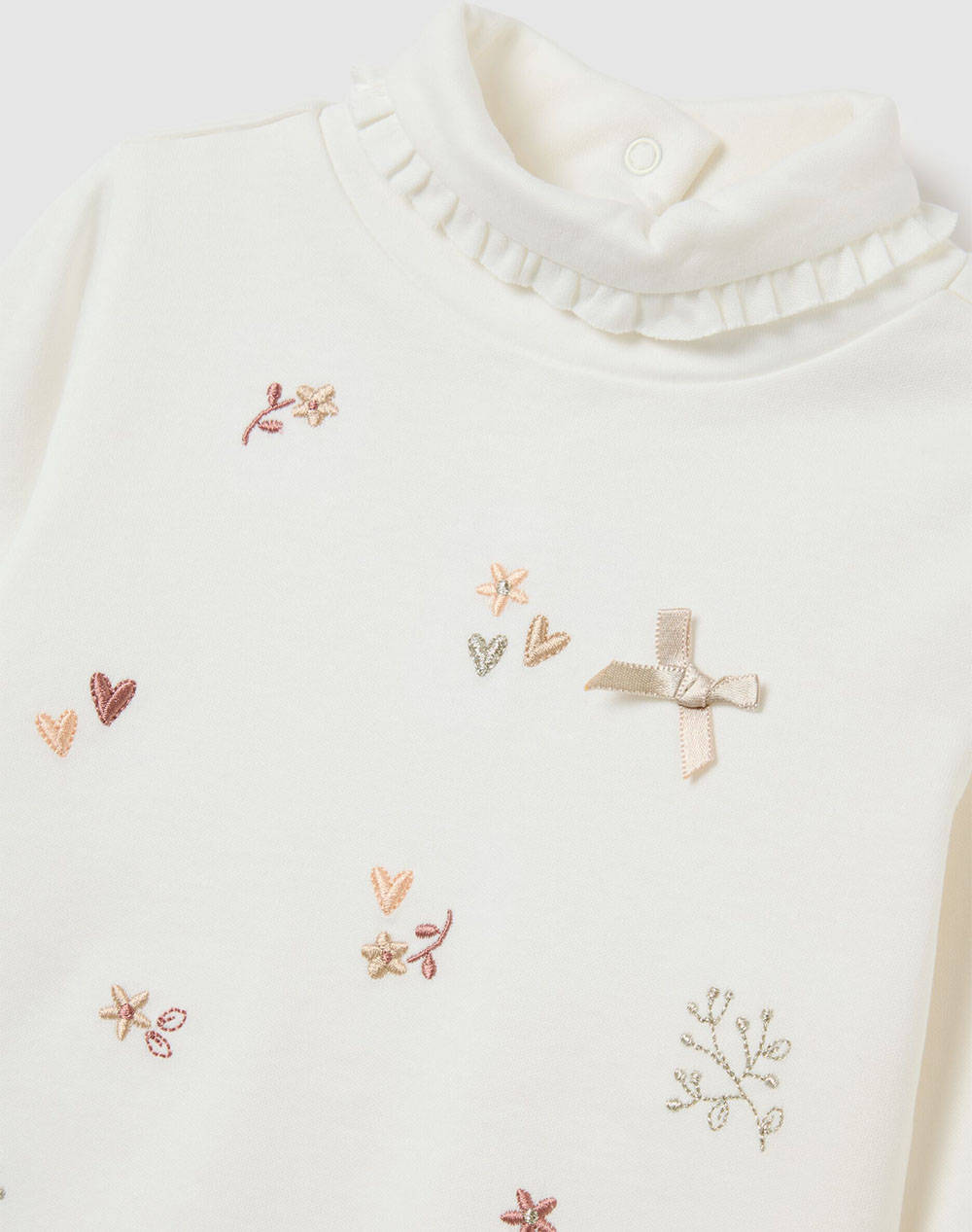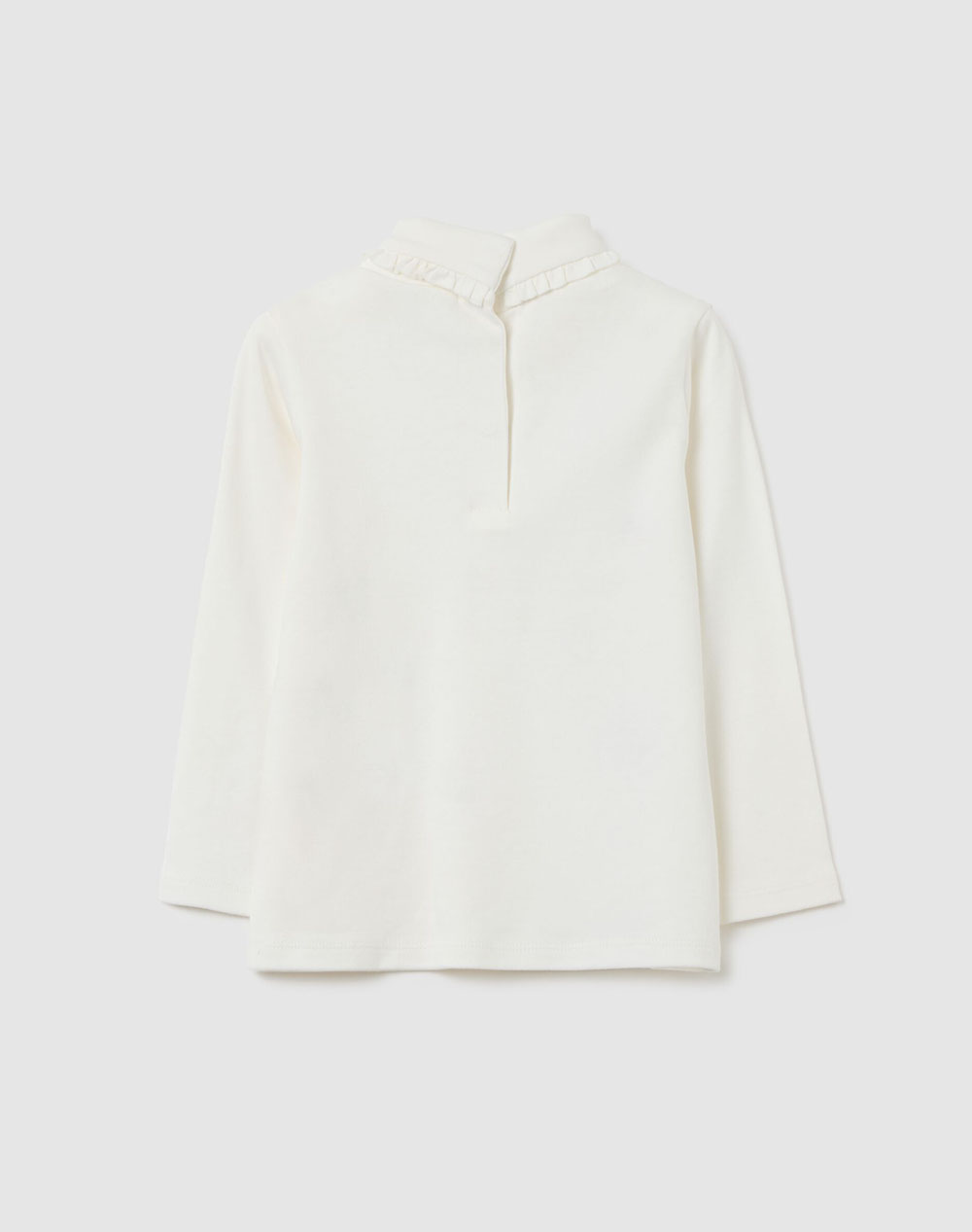 Baby shirt, regular fit, solid color, long sleeves, with embroidered designs on the front, high neck with ruffles and button closure on the back. (Composition: 100% Cotton)