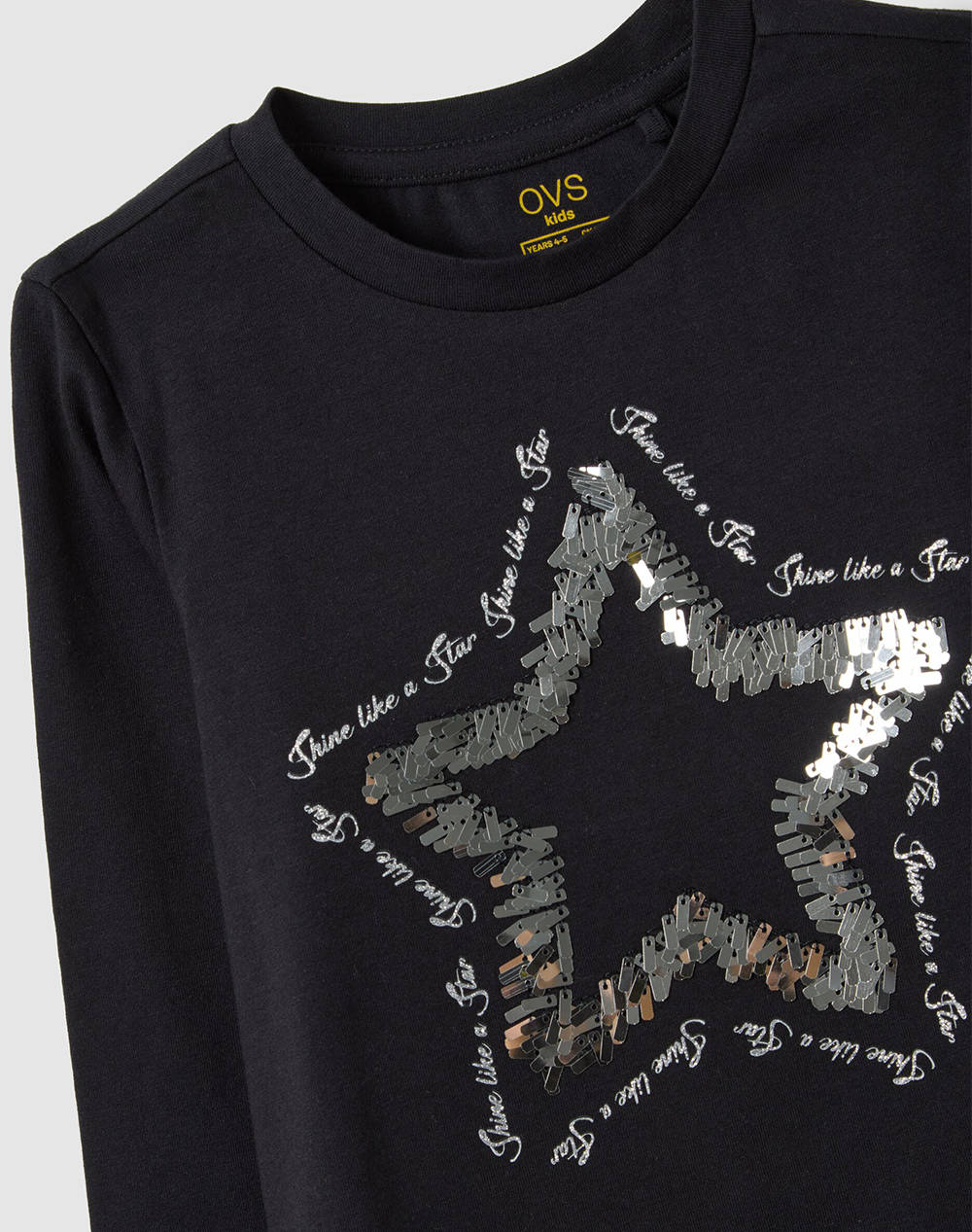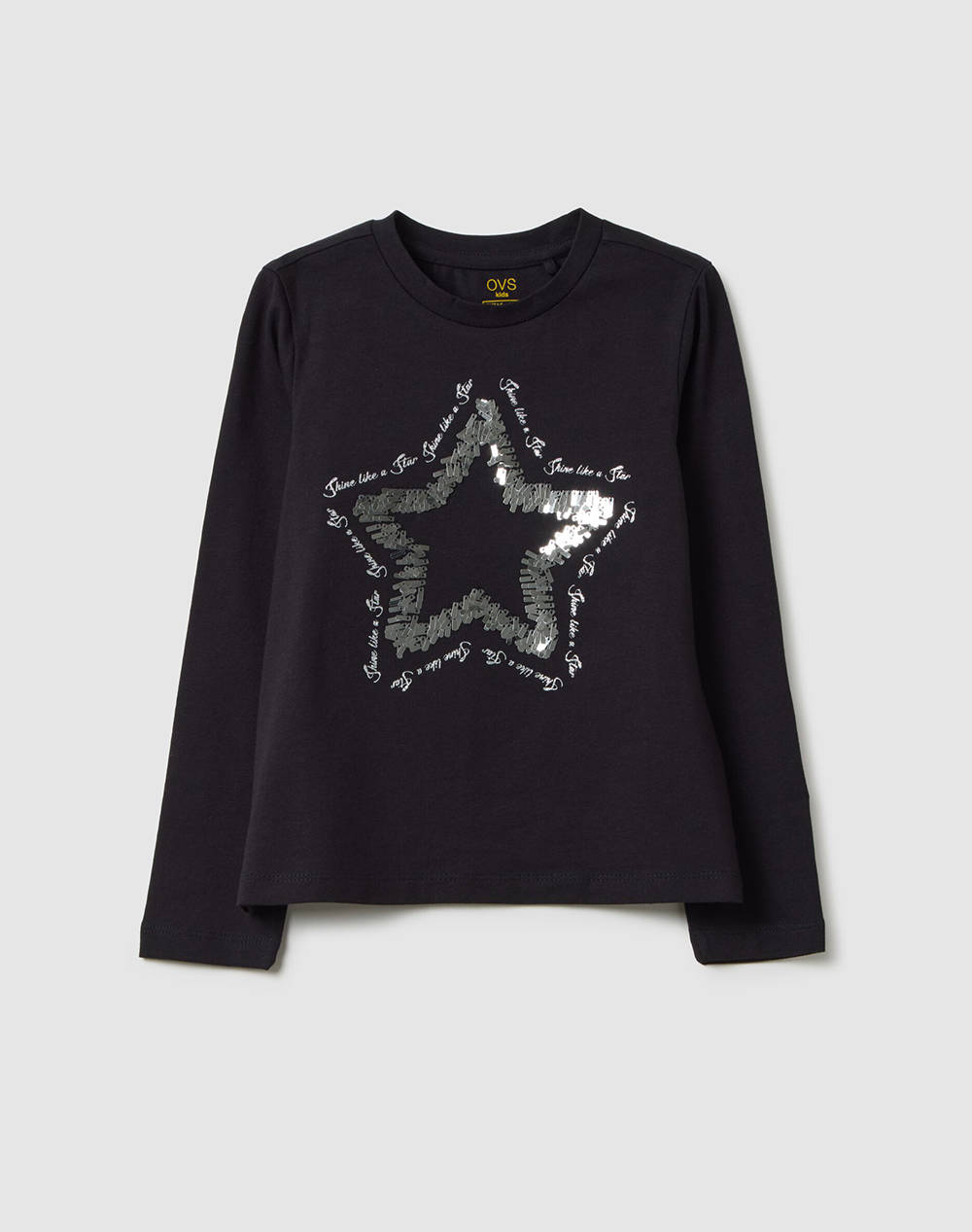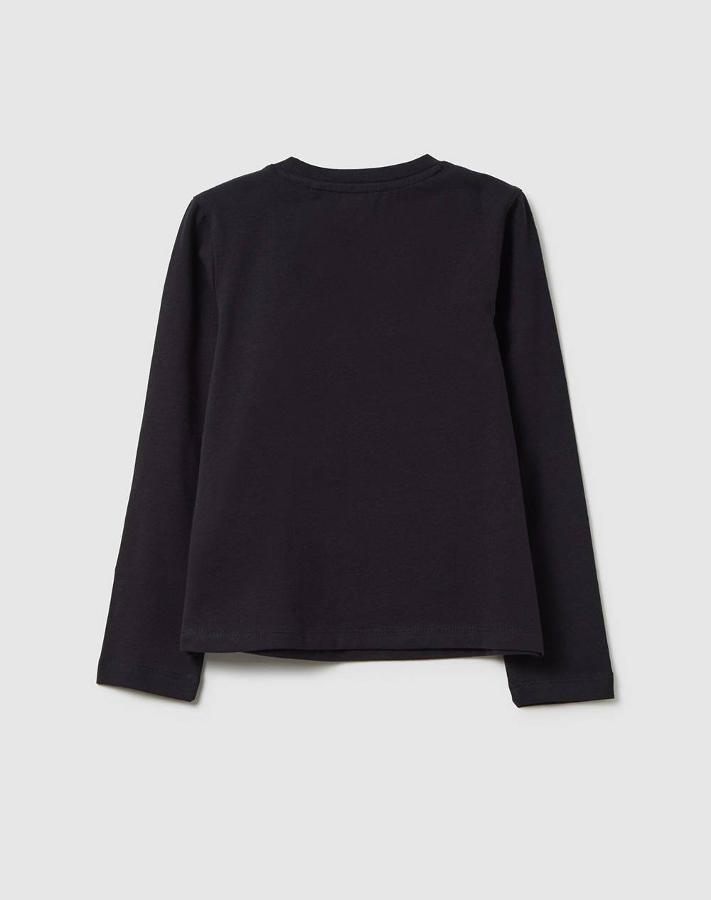 Kids' shirt, regular fit, long-sleeved, solid color, with sequins on the front and round neckline. (Composition: 95% Cotton, 5% Elastane)