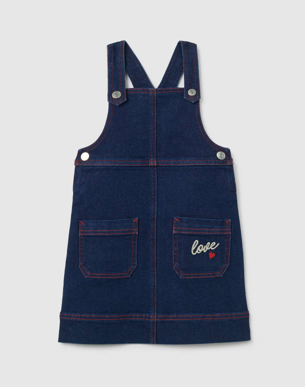 Kids' denim overalls, with pockets, contrasting seams, embroidery on the back and buttons on the straps and on the side. (Composition: 99% Cotton, 1% Elastane)