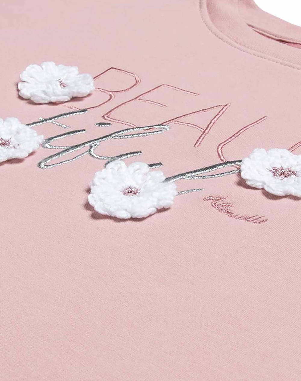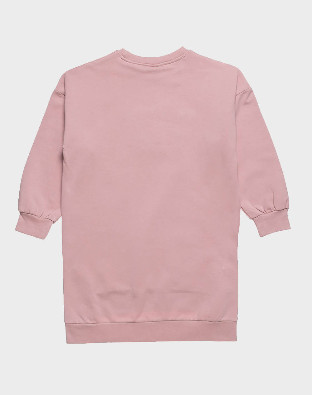 Kids' sweat dress, solid color, long sleeves, with knitted flowers on the front and side zipper openings. Age: 6 - 14 Years. (Composition: 95% Cotton, 5% Elastane)