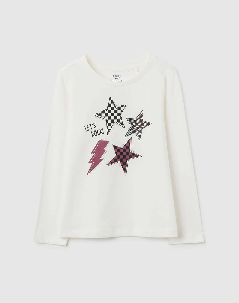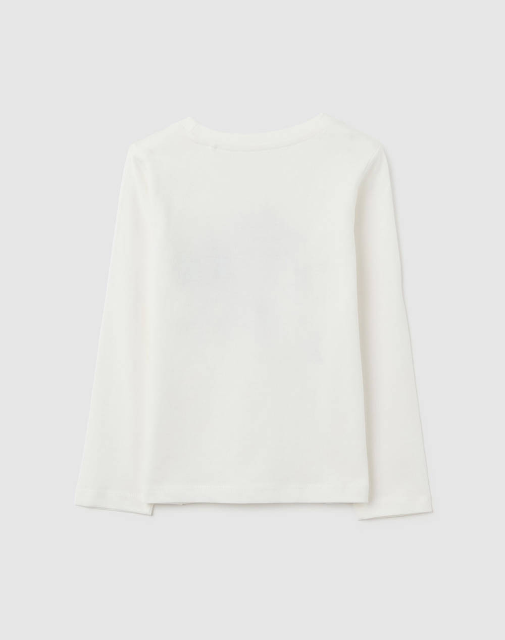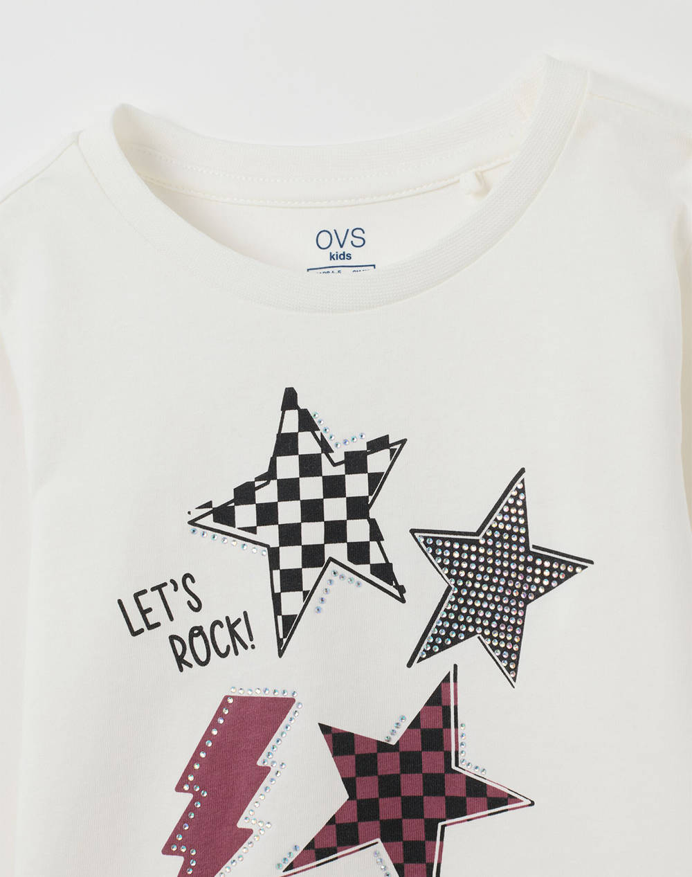 Kids' shirt, regular fit, long sleeves, with print and rhinestones on the front and round neckline. (Composition: 100% Cotton)