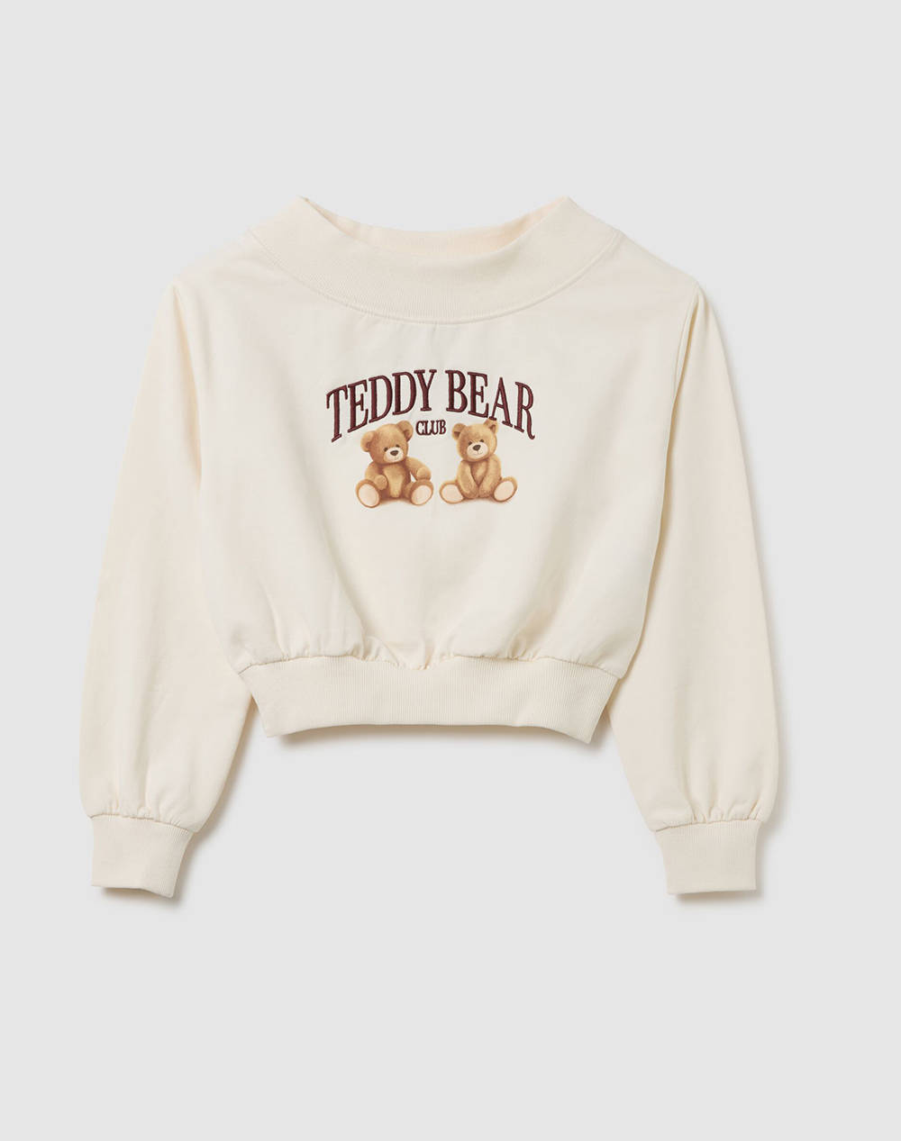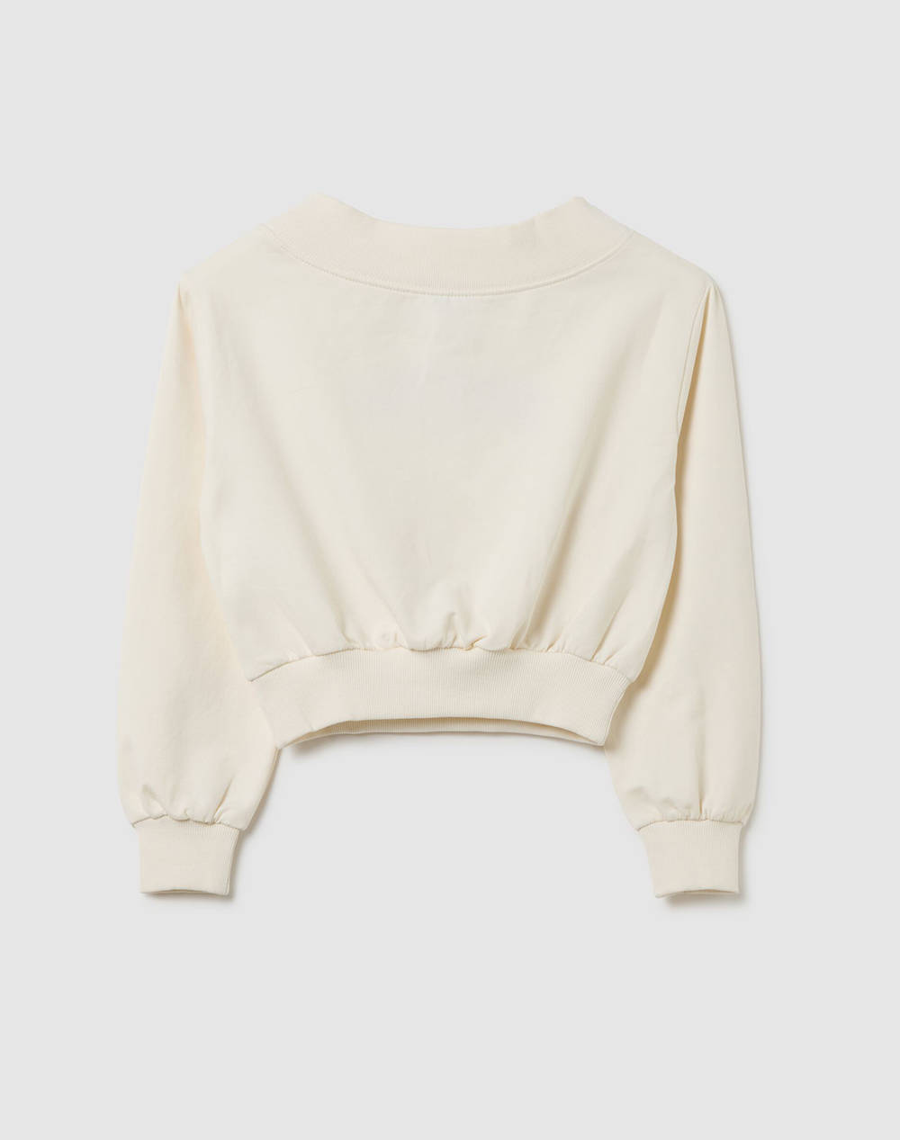 Kids' short sweatshirt, regular fit, solid color, long sleeves, with print on the front and round neckline. (Composition: 95% Cotton, 5% Elastane)