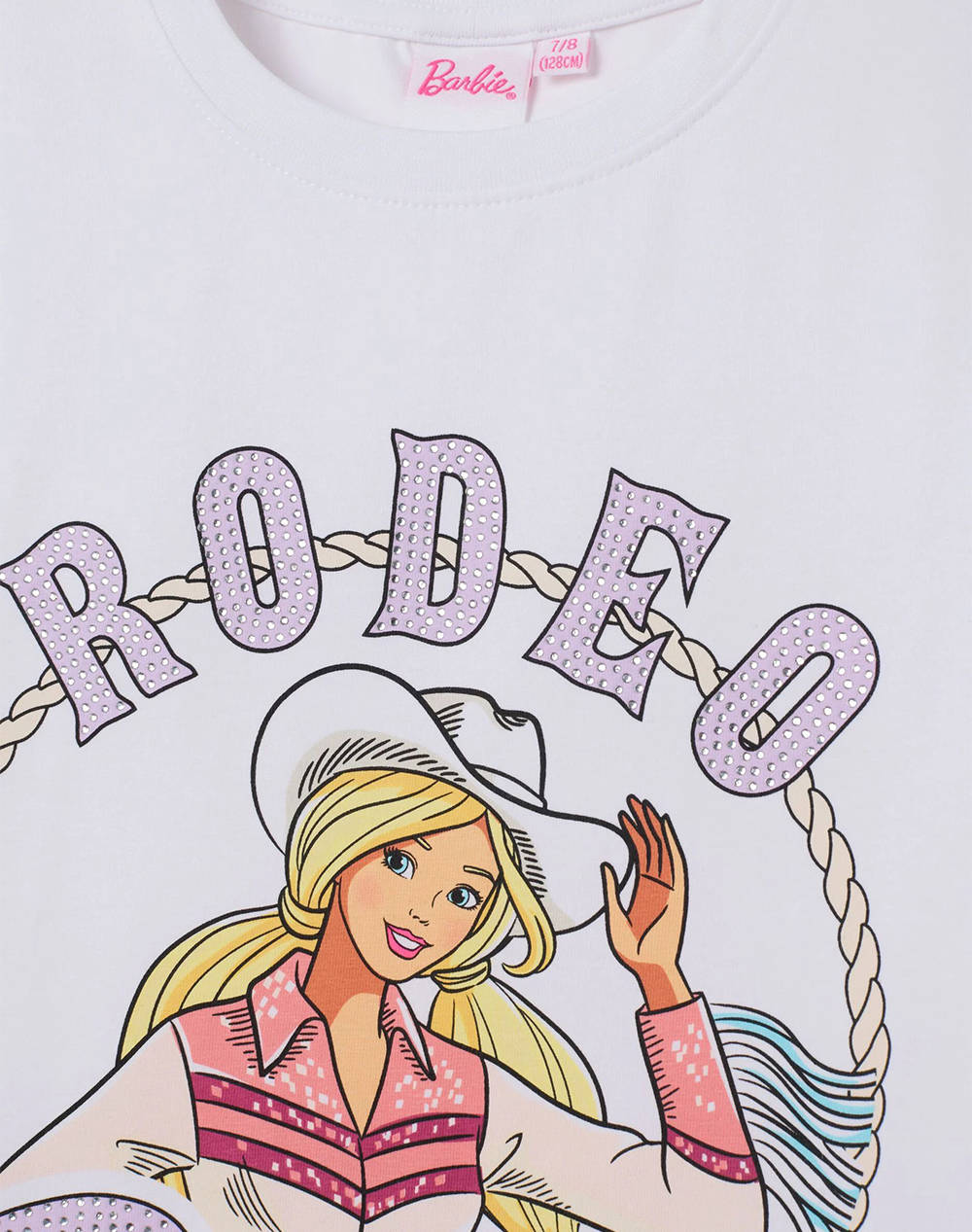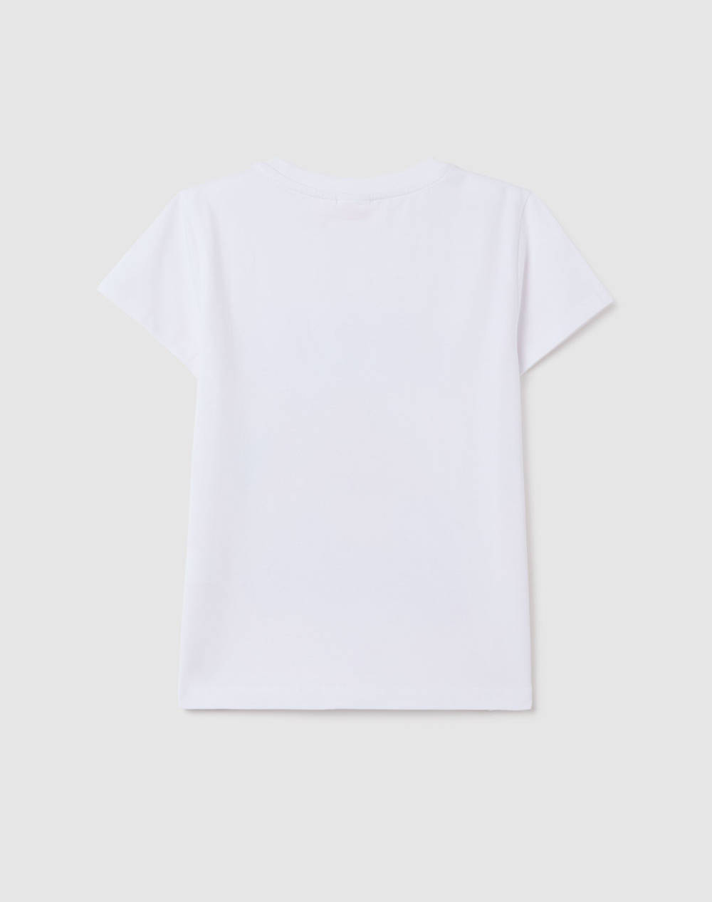 Kids' shirt, solid color, short sleeves, with print and rhinestones on the front and round neckline. (Composition: 95% Cotton, 5% Elastane)