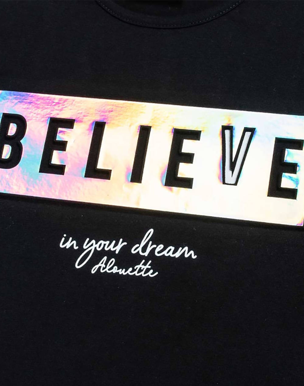 Kids' shirt, solid color, long sleeves, with embossed print on the front and round neckline. Age: 6 - 14 Years. (Composition: 95% Cotton, 5% Elastane)